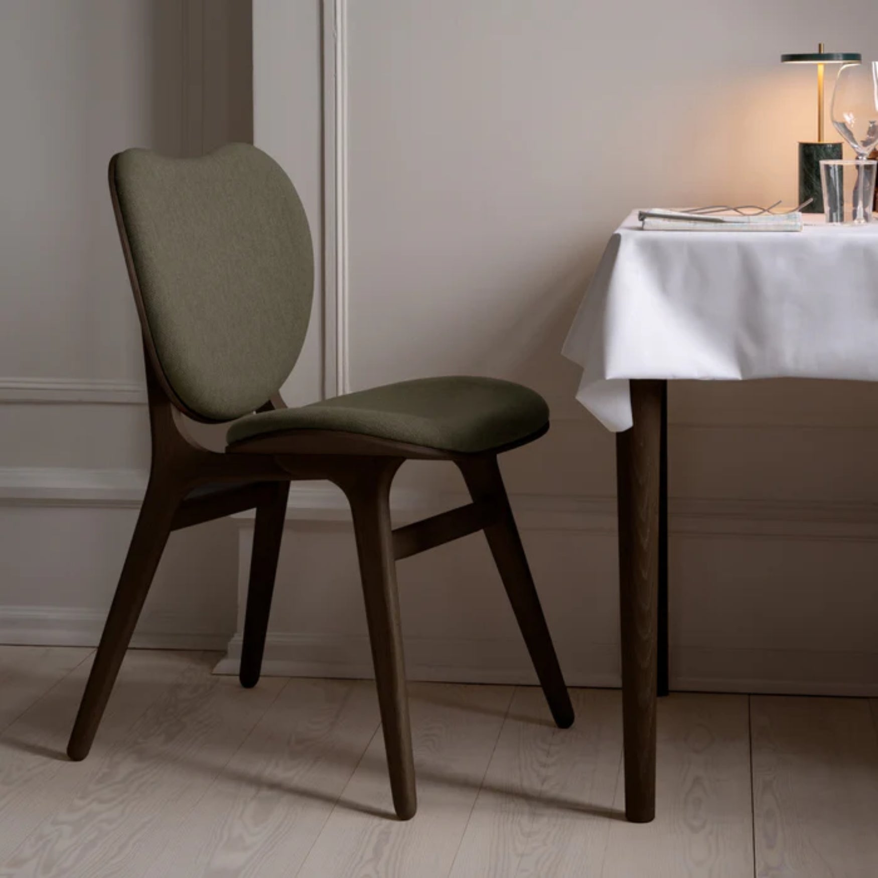 Das Esszimmerstuhl mit weicher, organischer Form vereint Eleganz, Komfort und kunsthandwerkliches Können. Entworfen von Anders Klem, begeistert es mit seiner leichten, skulpturalen Silhouette aus massivem Nussbaumholz und Furnier, abgerundeten Beinen und perfekt ausgearbeiteten Verbindungen der Rückenlehne. Dieses Möbelstück bringt Wärme, Gemütlichkeit und Raffinesse in Ihr Zuhause.
