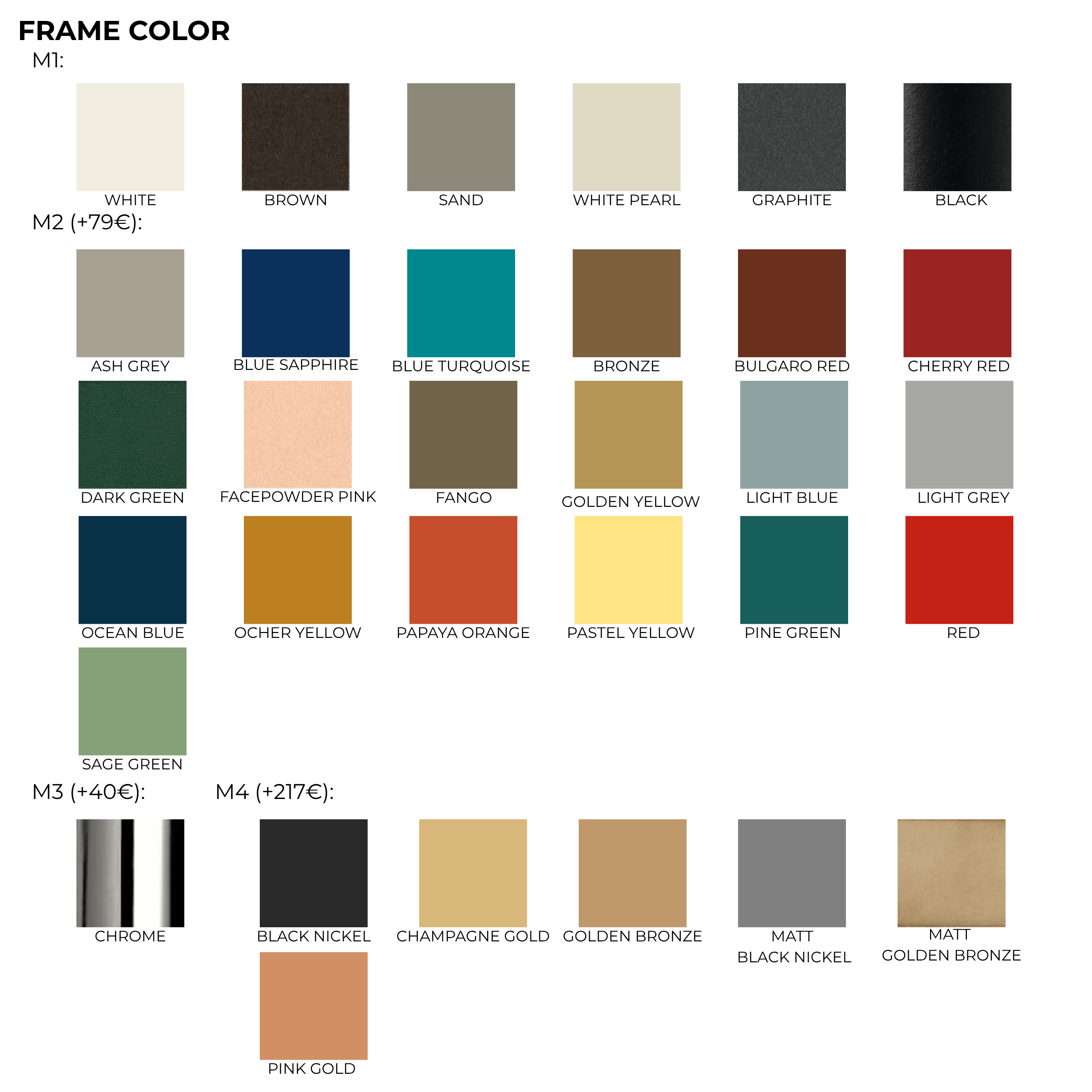 Black Nickel, Champagne Gold, Golden Bronze, Matt Black Nickel, Matt Golden Bronze, Pink Gold