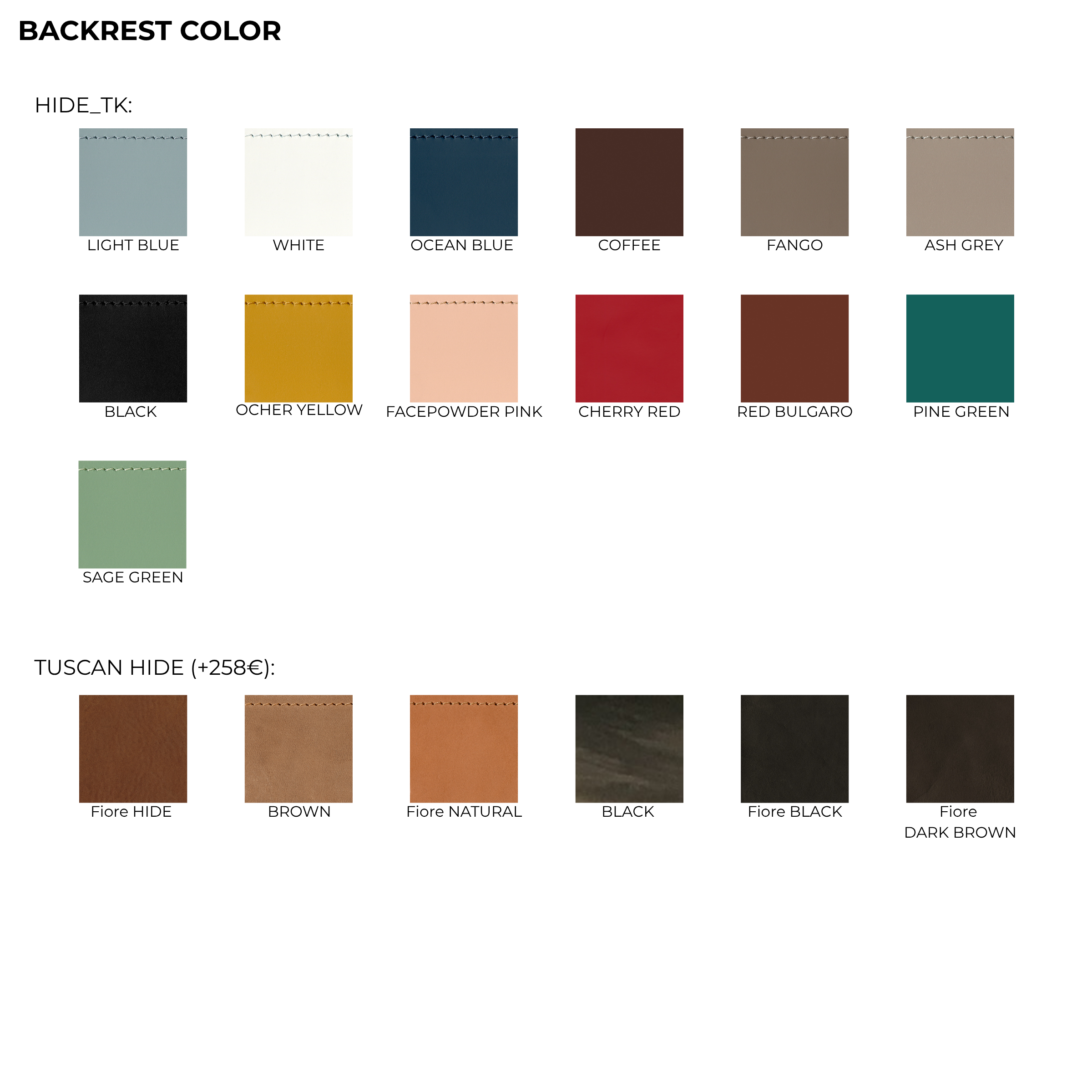 Aschgrau, Blauer Saphir, Blauer Türkis, Bronze, Bulgaro Rot, Kirschrot, Dunkelgrün, Puderrosa, Fango, Goldgelb, Hellblau, Hellgrau, Ozeanblau, Ocker, Papaya Orange, Pastellgelb, Kieferngrün, Rot, Salbeigrün
