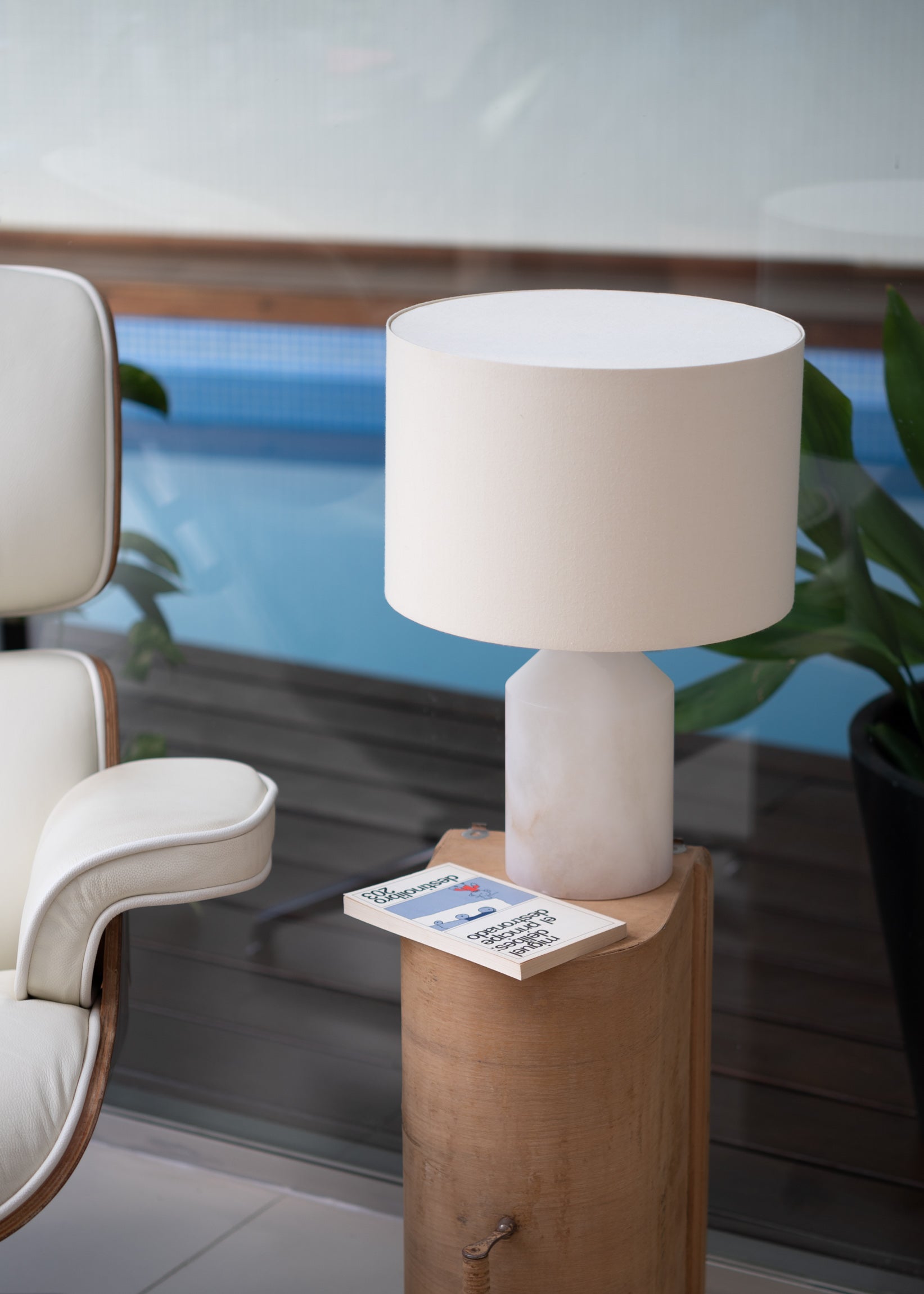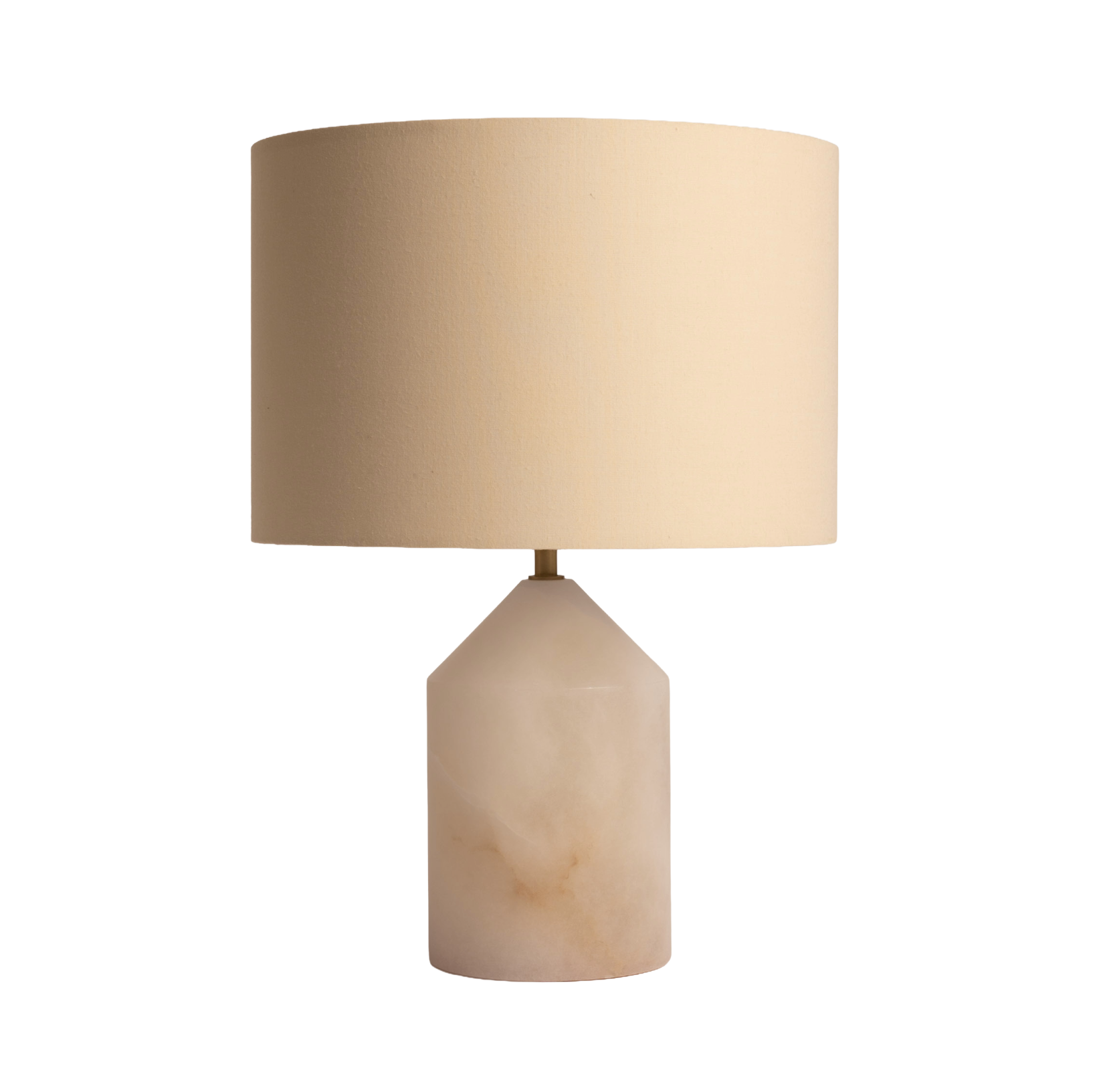 Tischlampe Josef vereint skulpturale Form und funktionales Design – ideal als Nachttischlampe, dekorative Tischlampe oder stimmungsvolles Licht für die Seite. Der zylindrische Sockel aus Alabaster kontrastiert mit dem weichen, baumwollenen Schirm in Zylinderform, der sanftes, gemütliches Licht streut. Die minimalistische Form und die hohe Verarbeitungsqualität machen sie zu einem außergewöhnlichen Accessoire für moderne, klassische oder Japandi eingerichtete Räume.