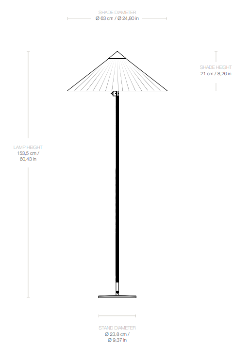 Bodenlampe 9602, auch bekannt als „Chinese Hat“, wurde 1935 vom finnischen Designmeister Paavo Tynell für das Hotel Aulanko entworfen. Ihr Markenzeichen ist der leichte und elegante Schirm in Kegelform, ergänzt durch einen Stiel, der mit natürlichem Rattan umwickelt ist.