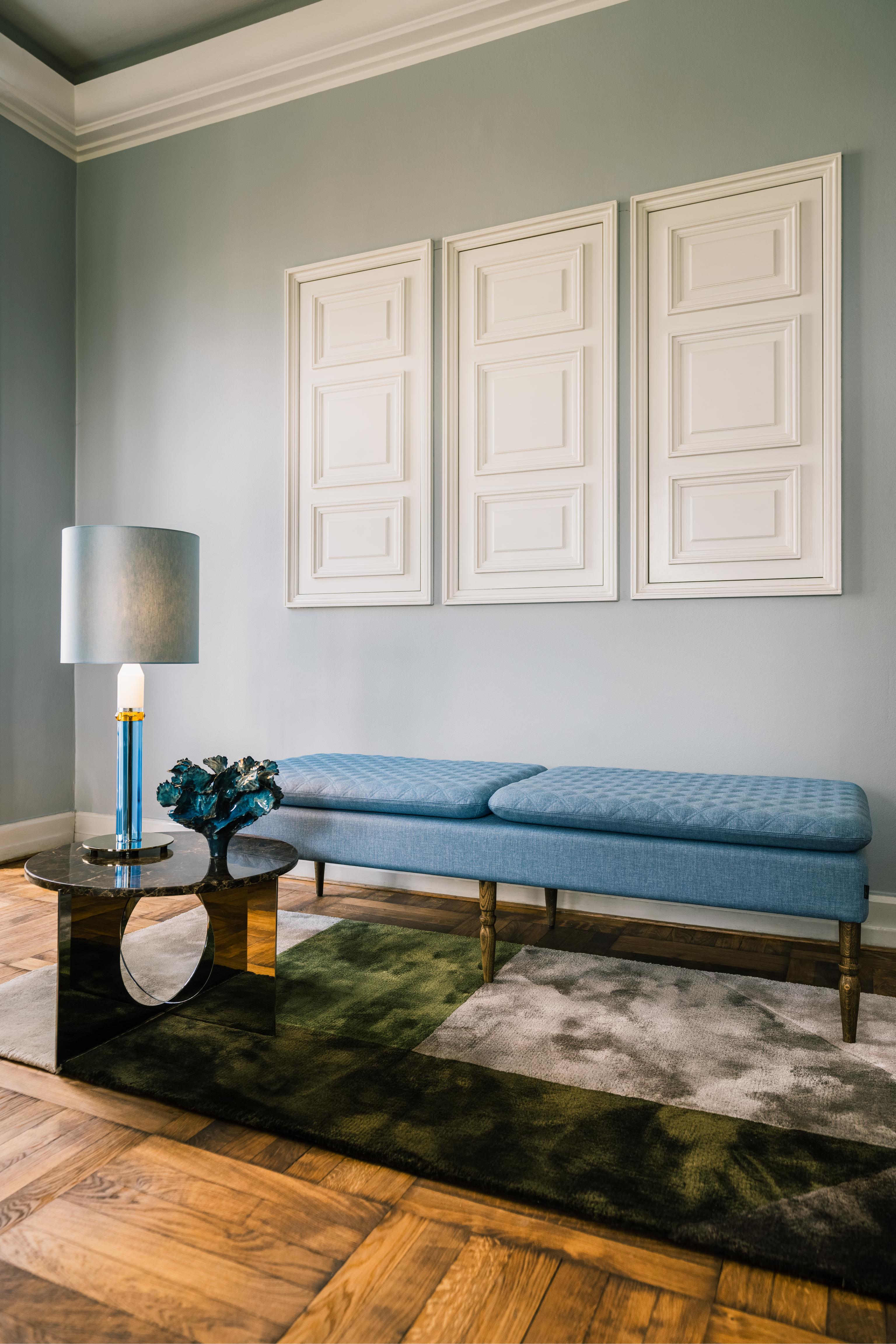 Jede Schreibtischlampe Carnival No. 1 ist ein handgefertigtes Kunstwerk. Der handgefertigte Seidenlampenschirm in hellblauen und weißen Farbtönen harmoniert perfekt mit dem goldenen Sockel und verleiht dem Gesamtbild einen exklusiven Charakter. Es ist eine Lampe, die Aufmerksamkeit erregt und eine künstlerische, luxuriöse Atmosphäre in den Raum bringt – ideal für das Wohnzimmer, das Schlafzimmer oder ein repräsentatives Büro.