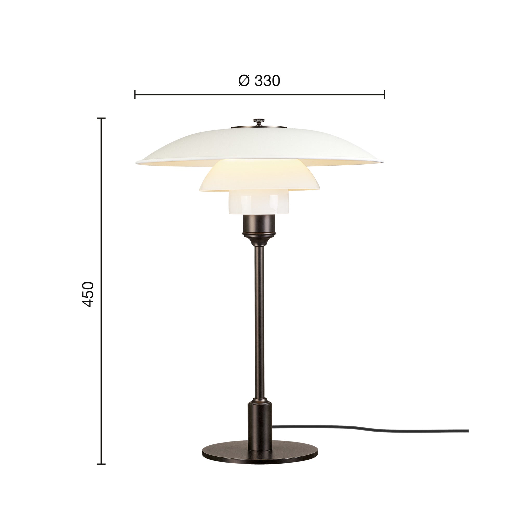 Tischlampe PH 3½-2½ ist ein klassisches Design von Poul Henningsen aus dem Jahr 1928, das eine Weiterentwicklung seines berühmten dreischirmigen Beleuchtungssystems darstellt. Sie wurde mit dem Ziel entworfen, ein Licht zu schaffen, das völlig blendfrei ist, während gleichzeitig ein weiches, augenfreundliches Licht erhalten bleibt. Der obere, metallene Schirm mit gerolltem Rand verleiht der Lampe ein elegantes Aussehen und erhöht ihre optische Stabilität, während die beiden unteren Schirme aus mundgeblasenem opalinem Glas das Licht gleichmäßig streuen. Dadurch sorgt die Tischlampe für eine ideale Beleuchtung zum Lesen, Arbeiten oder Entspannen und schafft gleichzeitig eine außergewöhnlich gemütliche Atmosphäre.