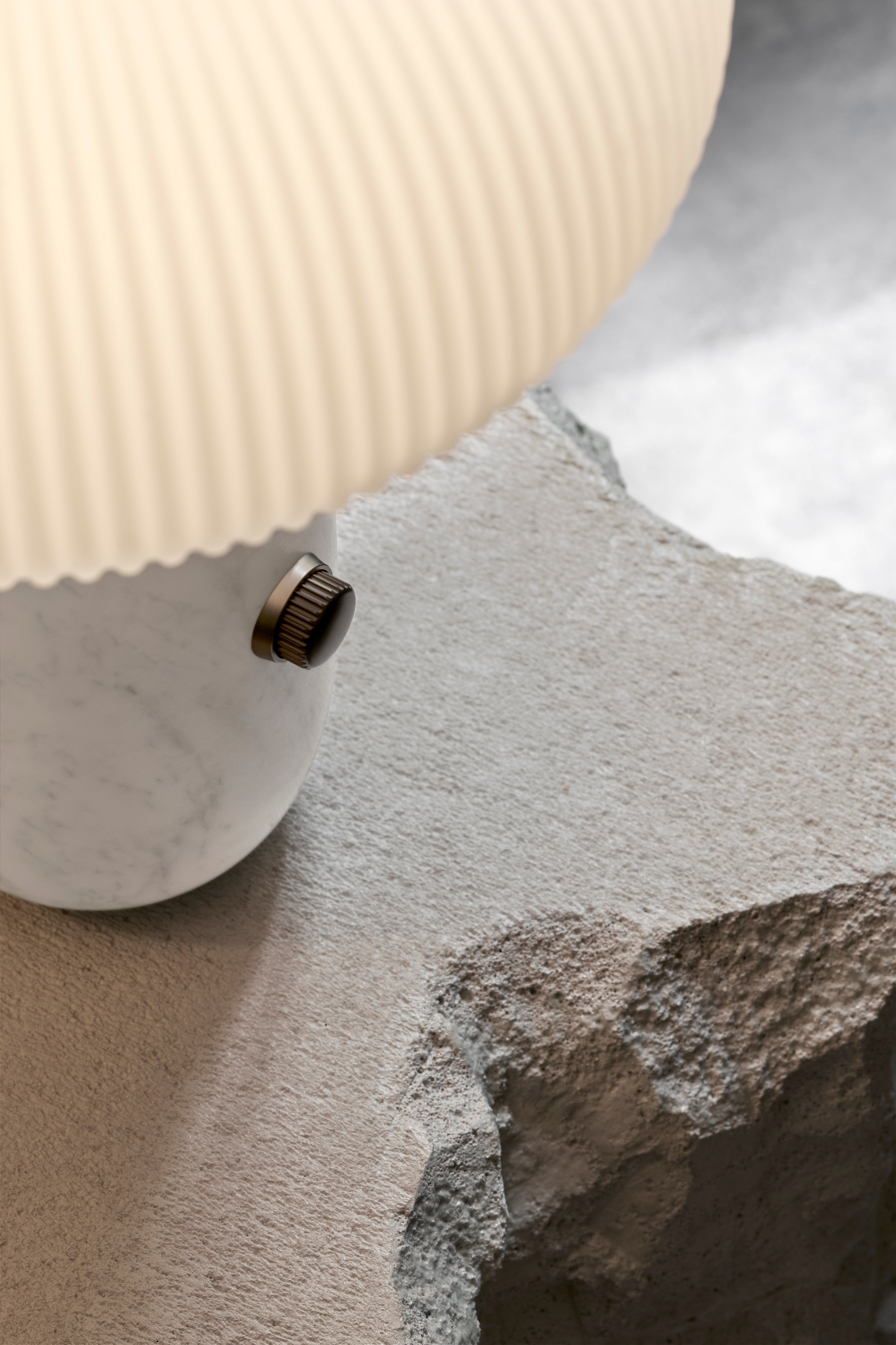 Die aus traditionellem Blasen gefertigte Glaskuppel begeistert mit ihrer zarten Struktur, während der Marmorzylinder in Weiß oder Grau die natürliche Maserung des Steins zur Geltung bringt. Diese dekorative Tischlampe nutzt eine langlebige LED-Quelle mit einer Lebensdauer von 50.000 Stunden und bietet eine moderne, energieeffiziente und äußerst langlebige Beleuchtungslösung. Sie ist die ideale Wahl für diejenigen, die zeitloses Design und gemütliches, gleichmäßiges Licht suchen.