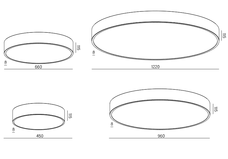 Średnice opraw: 45 / 66 / 96 / 122 cm