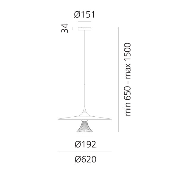 Die metallene Scheibe im oberen Teil geht sanft in einen sich verjüngenden Kegel über, der den Blick harmonisch zum Aufhängungspunkt lenkt. Ipno ist eine moderne Hängelampe, die Technologie mit Eleganz verbindet und eine hohe Lichtqualität bei gleichzeitiger Beibehaltung eines einzigartigen visuellen Effekts bietet.