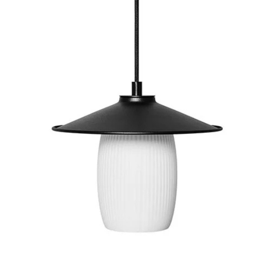 Die Pendelleuchte Jingu ist eine harmonische Verbindung von klassischer Eleganz und modernem Design. Der charakteristische, geriffelte Schirm aus mattem Glas streut das Licht sanft und schafft eine gemütliche Atmosphäre in jedem Raum.