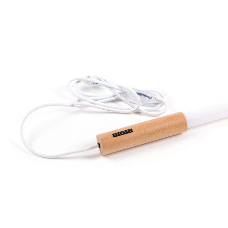 Die Lampe besteht aus Glas, Kunststoff und Holz