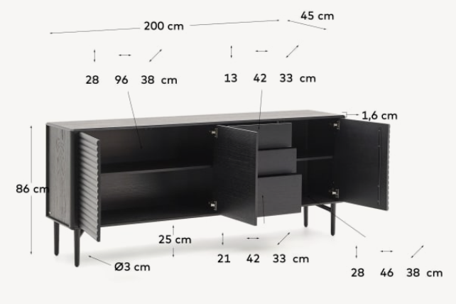 Kommode Lenon ist ein elegantes und funktionales Möbelstück, das aus massivem Holz und Eichenfurnier mit schwarzer Buntfarbe besteht. Ausgestattet mit 3 Türen mit Drucköffnung und ruhigem Schließen sowie 3 Schubladen mit versteckten Guides bietet die Truhe der Schubladen außergewöhnliche Nutzungsbequemlichkeit. Darüber hinaus können Sie verstellbare Beine und Regale an den individuellen Bedürfnissen anpassen.