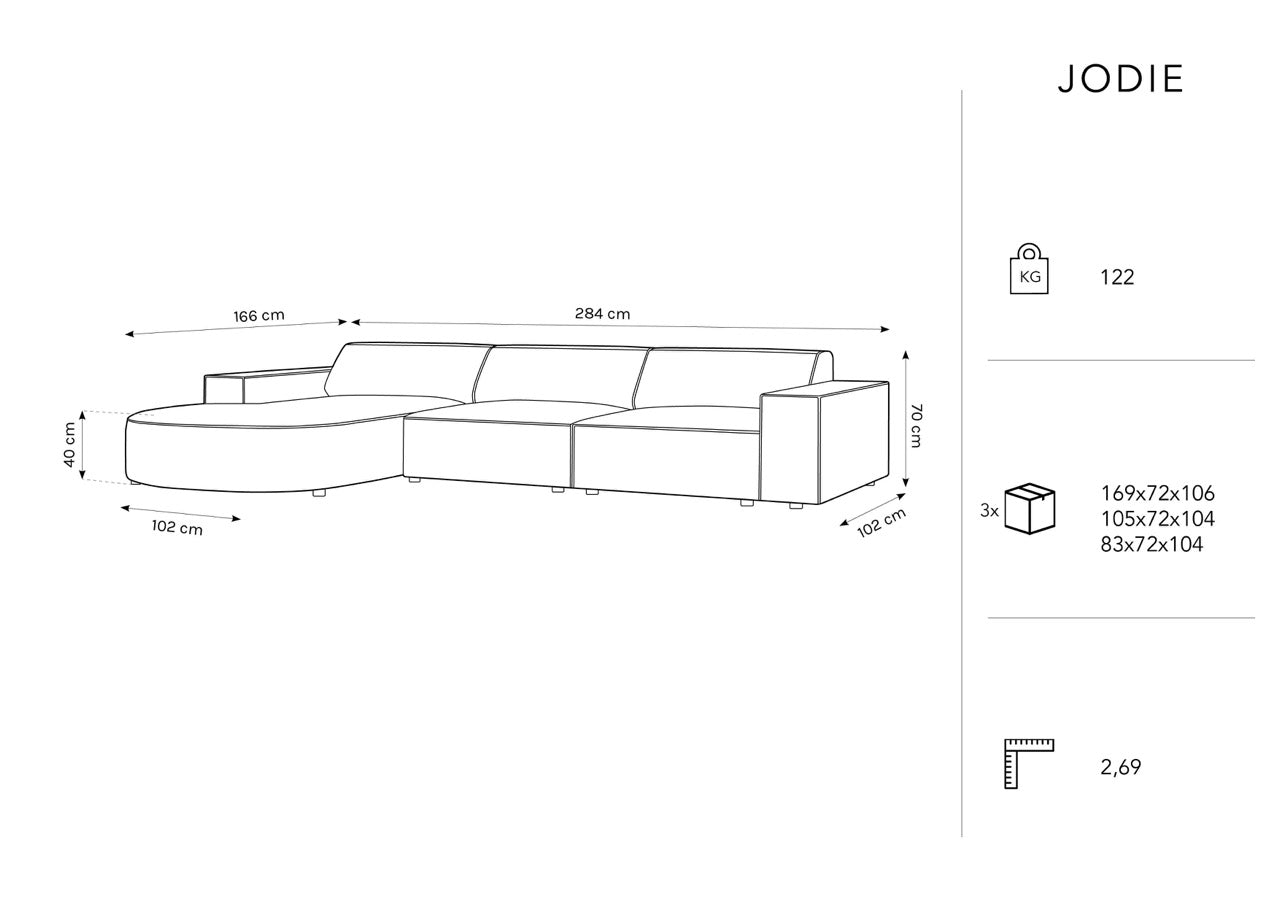 Die Sitzfläche des Sofas besteht aus samtigem Stoff, der nicht nur Komfort, sondern auch Langlebigkeit und Widerstandsfähigkeit gegen Beschädigungen garantiert. Das Jodie-Sofa ist zudem sehr praktisch - es kann je nach Bedarf mit einer linken oder rechten Seite bestellt werden.