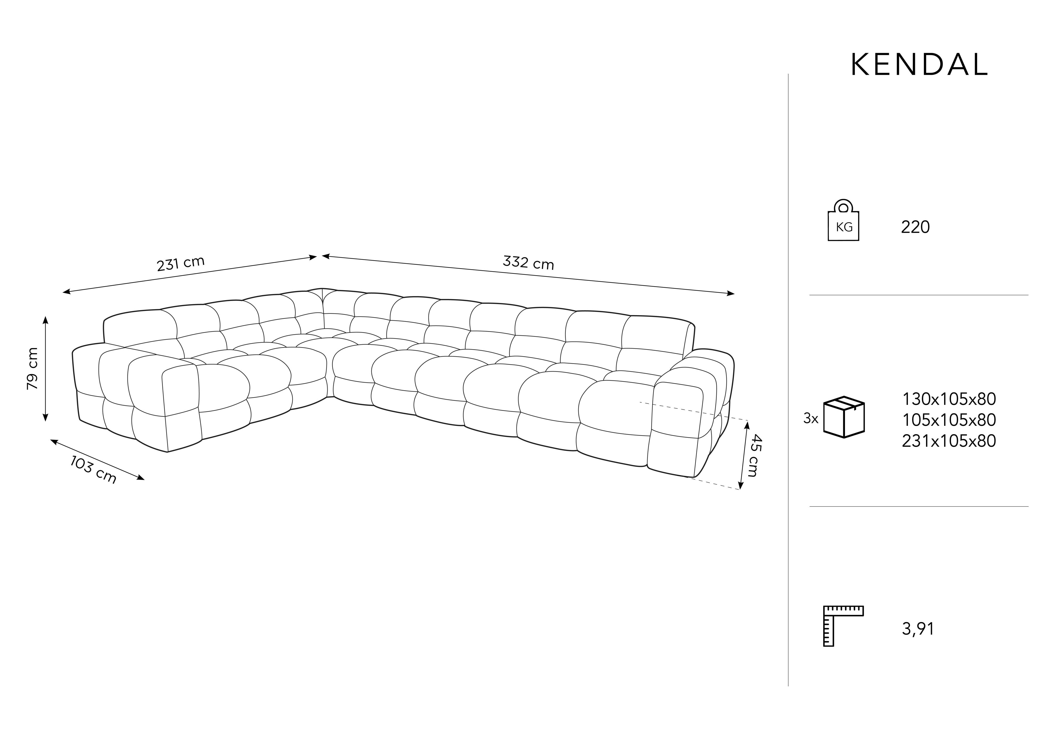 Samet-Ecksofa für sechs Personen Kendal begeistert mit außergewöhnlichen Nähten und Steppungen, die dem Raum eine außergewöhnliche Eleganz im modernen klassischen Stil verleihen. Die bauchige Sitzfläche in Kombination mit der stilvollen Rückenlehne und den breiten Armlehnen schafft einen komfortablen Ort zum Entspannen nach einem langen Tag.Kendal überrascht mit einer etwas avantgardistischen Form und zieht die Aufmerksamkeit auf sich, egal von welcher Seite wir sie betrachten.
