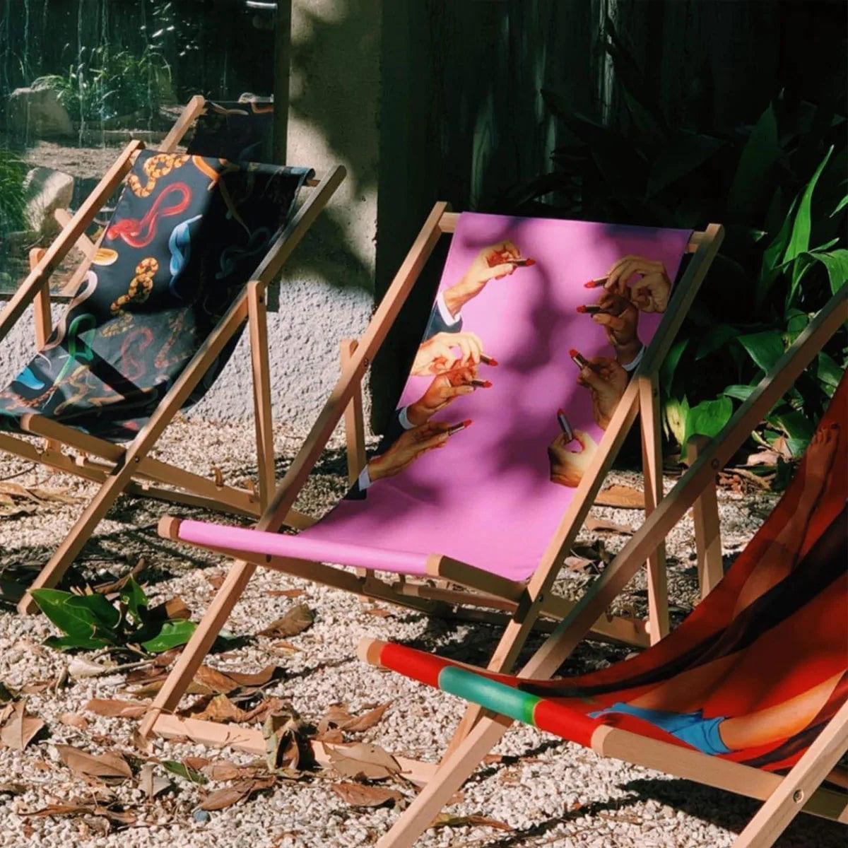 Designer gesargt Lippenstifte der italienischen Marke Seletti sind eine Garantie für ständige Feiertage! Setzen Sie sich bequem, nehmen Sie Ihr Lieblingsmagazin mit und trinken Sie ein Getränk, als würde niemand Sie beobachten. Die Sonnenlasse besteht aus hochwertigem Buchenholz und UV -resistentem Material. Es hat eine dreistöckige Rückenlehre eingestellt.