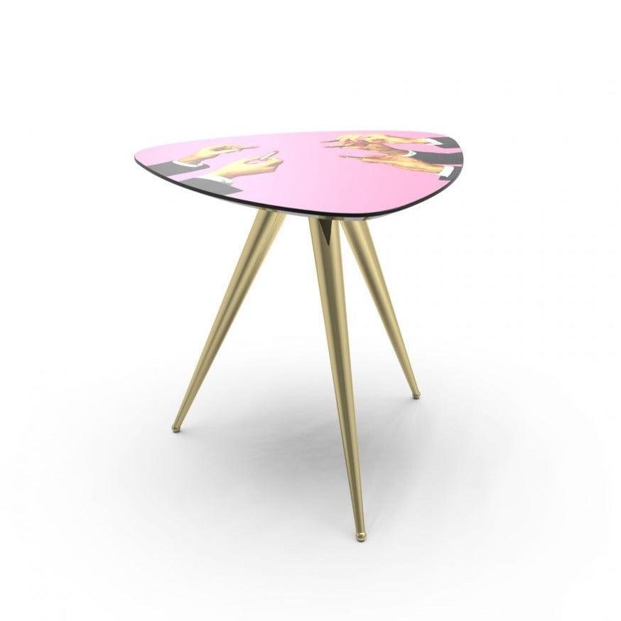Lippenstifte zu Designer -Seitentisch im Stil der 1950er Jahre, die Wie ein Tor zu einer anderen surrealen Dimension verleiht es dem Innenraum einen einzigartigen Charakter. Goldene Beine und eine lebhafte, leicht kontroverse Collage auf der Theke erzeugen ein originelles Kunstwerk.