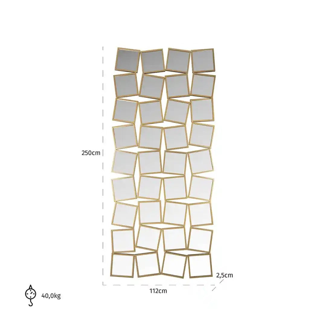 Effektiver dekorativer Spiegel Badia in einem goldenen Rahmen mit geometrischem Muster ist ein modernes Element, das die Aufmerksamkeit auf sich zieht und den Charakter des Raumes unterstreicht. Die Konstruktion, die aus vielen spiegelnden Modulen besteht, schafft eine originelle, dreidimensionale Komposition, die das Licht wunderschön reflektiert und dem Raum Tiefe verleiht. Ideal für ein großes Wohnzimmer, eine Diele oder einen gewerblichen Raum als außergewöhnliche Wanddekoration.