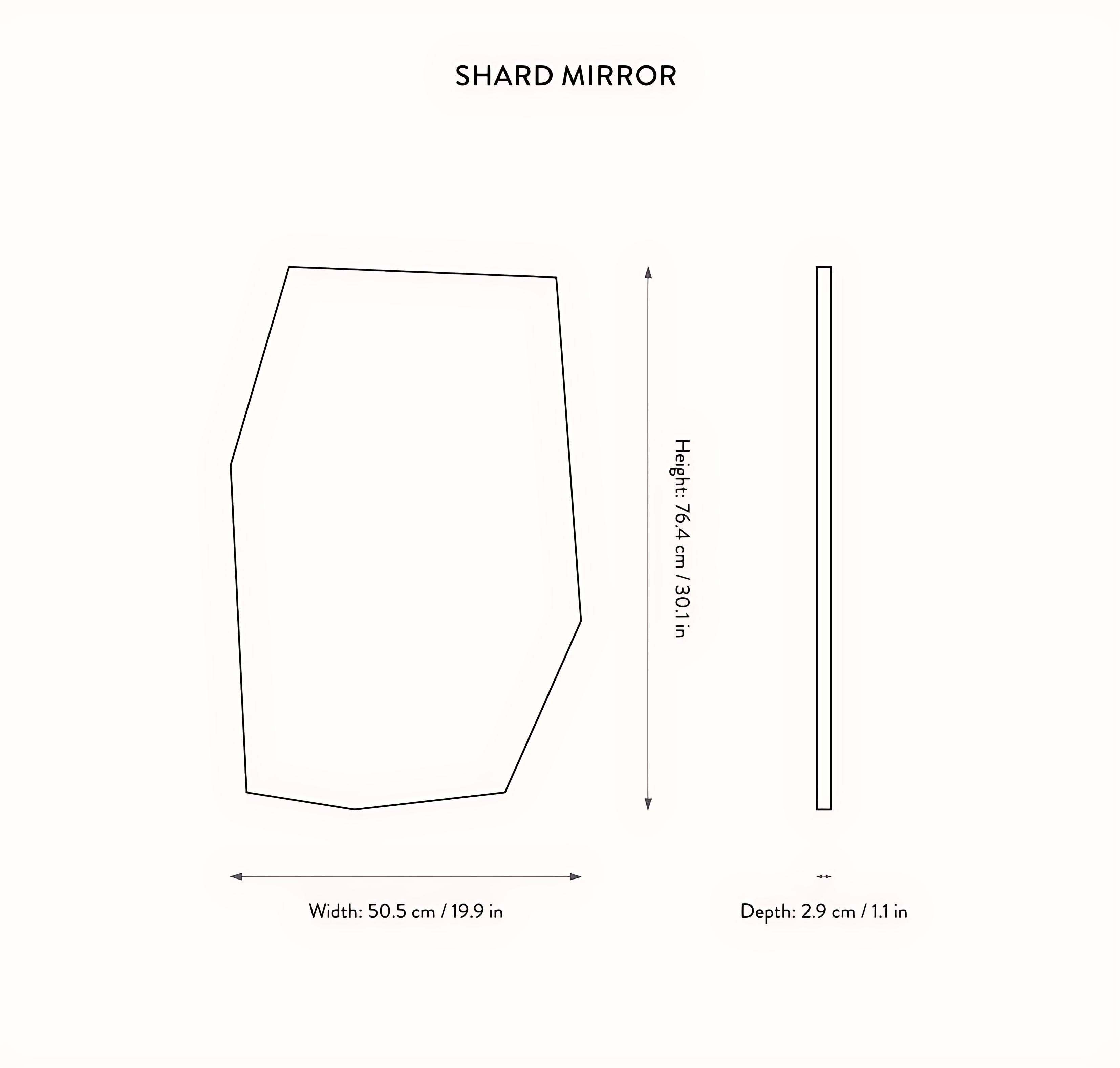 Der Shard- Spiegel besteht aus hochwertigem Spiegelglas, während das MDF-Rückfurnier für Stabilität sorgt. Die mitgelieferten L-förmigen Wandschrauben ermöglichen ein einfaches Aufhängen des Spiegels. Der Abstand zwischen den Befestigungslöchern beträgt 20 cm, was die Installation erleichtert. Die schwarze Farbe des Spiegelrahmens passt perfekt in moderne und minimalistische Innenräume.