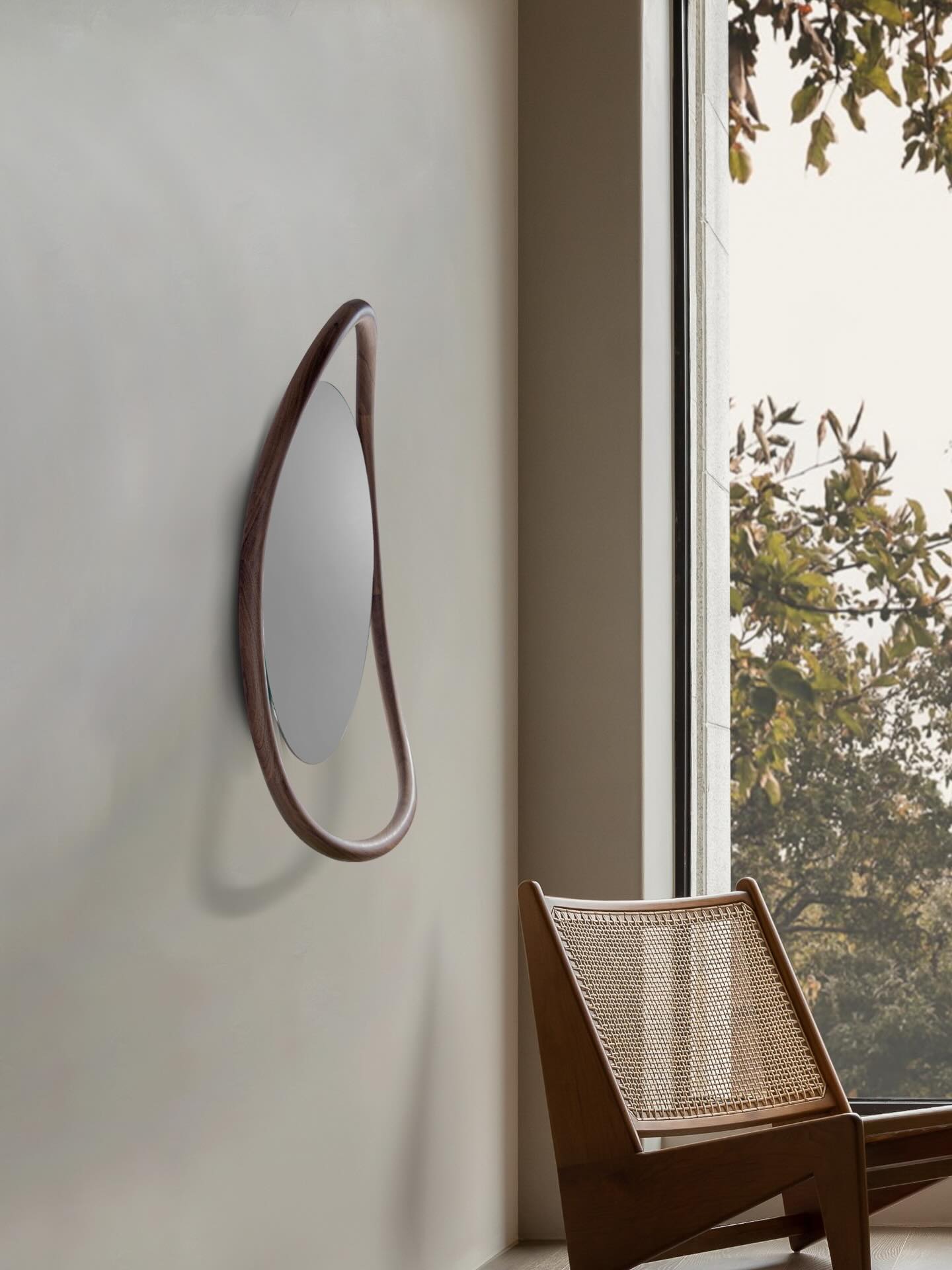 Lustro Unut ist eine einzigartige Verbindung von Handwerk und modernem Design, die dem Raum Charakter und Eleganz verleiht. Handgefertigt aus massivem, natürlichem Nussbaum, begeistert es mit organischen, fließenden Linien und perfekt ausgewogenen Proportionen. Die gebogene Form des Holzrahmens unterstreicht den einzigartigen Charakter des Designs, während die manuelle Politur die Tiefe der Farbe und die natürliche Maserung hervorhebt. Dieses designorientierte Spiegel aus massivem Holz ist nicht nur ein funktionales Element der Einrichtung, sondern auch ein skulpturaler dekorativer Akzent.