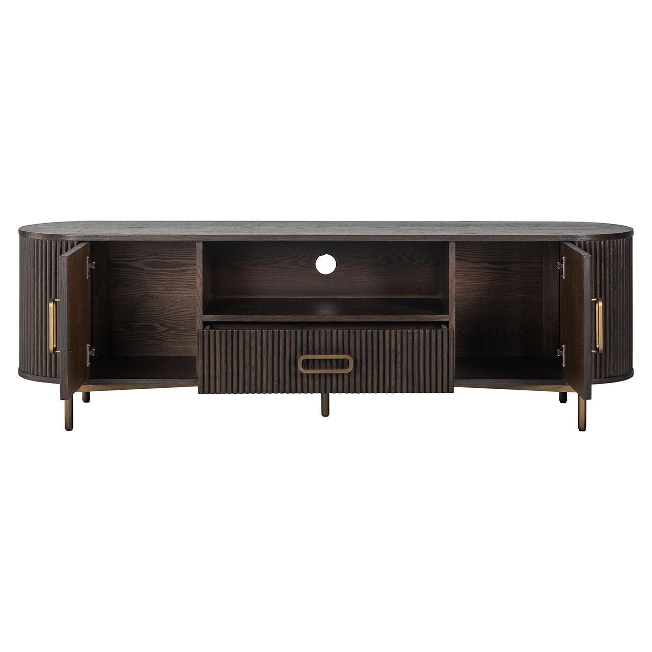 Kabinett Das RTV besteht aus Eichenholz, was seine Haltbarkeit und sein natürliches Aussehen gewährleistet. Metallgoldgriffe und ein Lamelon -Finish verleihen den Möbeln Eleganz und Klasse. Diese Möbel sind auch äußerst praktisch. Es hat ein offenes Regal für Fernsehgeräte, zwei geschlossene Schränke und eine Schublade. Mit diesen funktionalen Lösungen können Sie verschiedene Gegenstände ästhetisch speichern.