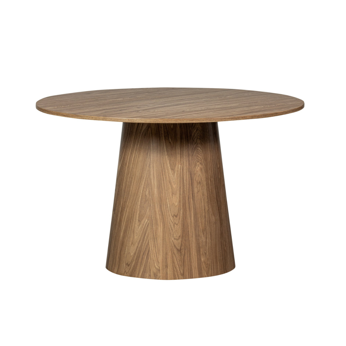 Runder Tisch Maan ist ein zeitloses Möbelstück, das Klassiker mit einem modernen Finish kombiniert. Dank des soliden Designs und des eleganten Erscheinungsbilds wird dieser Tisch zum Mittelpunkt jedes Speisesaals. Das Top mit einem Durchmesser von 120 cm bietet einen komfortablen Raum für vier Personen und bietet einen komfortablen Ort für gemeinsame Mahlzeiten, Besprechungen und Gespräche. Ein dunkelbraunes Finish mit einem klaren Holzkorn verleiht ihm einen warmen, natürlichen Charakter, der perfekt in die Arrangeln von Boho, Retro oder Botanical passt.