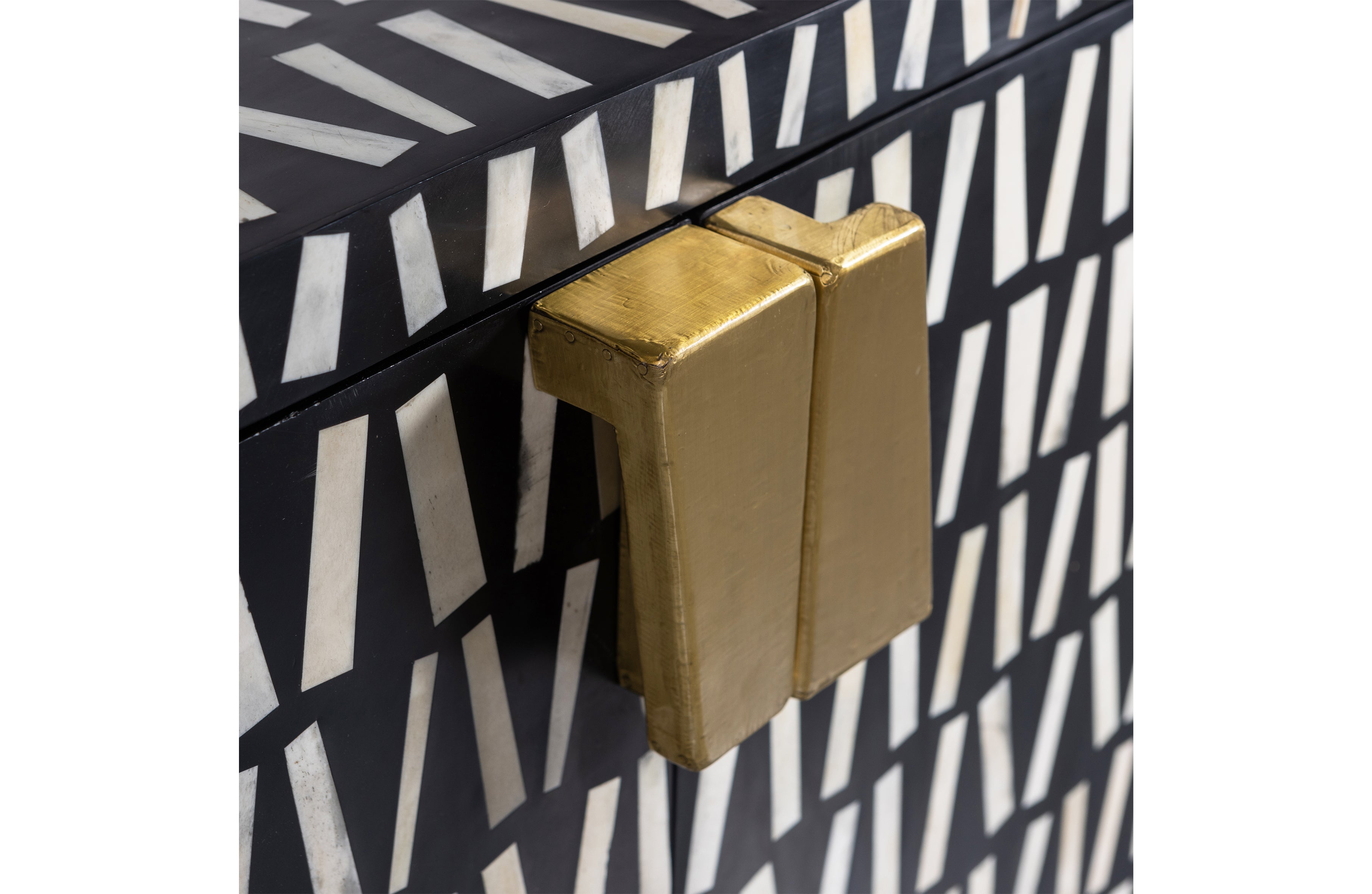 Kommode Menne aus Mangoholz ist ein einzigartiges Möbelstück, das mit seiner dekorativen Front und seiner eleganten Finish sofort die Aussicht auffällt. Der Designercharakter wird durch ein handgefertigtes Mosaik natürlicher Knochen hervorgehoben - ein Rohstoff, das aus organischen Abfällen gewonnen wird, was ihn sowohl ästhetisch als auch eine bewusste Wahl macht. Schwarzes mattes Mangoholz verleiht die gesamte Tiefe und den Charakter, und eine schlanke Metallbasis sorgt für Leichtigkeit. Menne bietet nicht nur Stil, sondern auch Praktikabilität - im Inneren gibt es viel Platz, um die notwendigsten Dinge zu speichern.