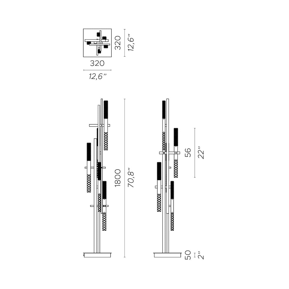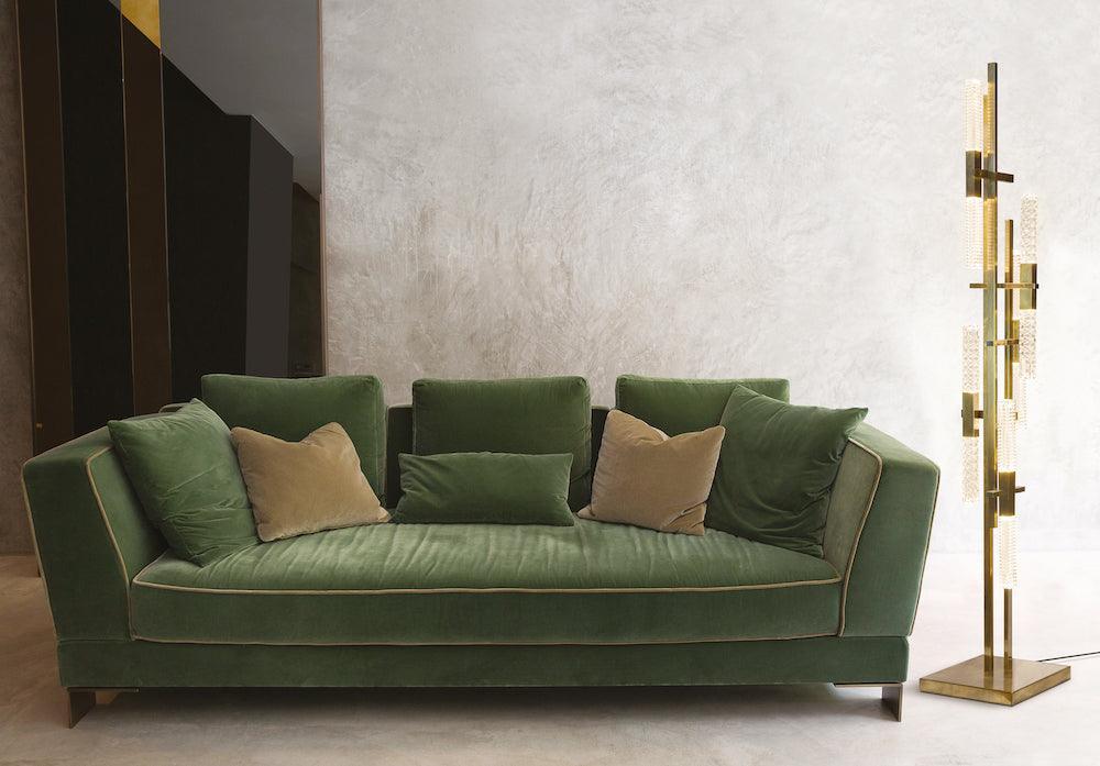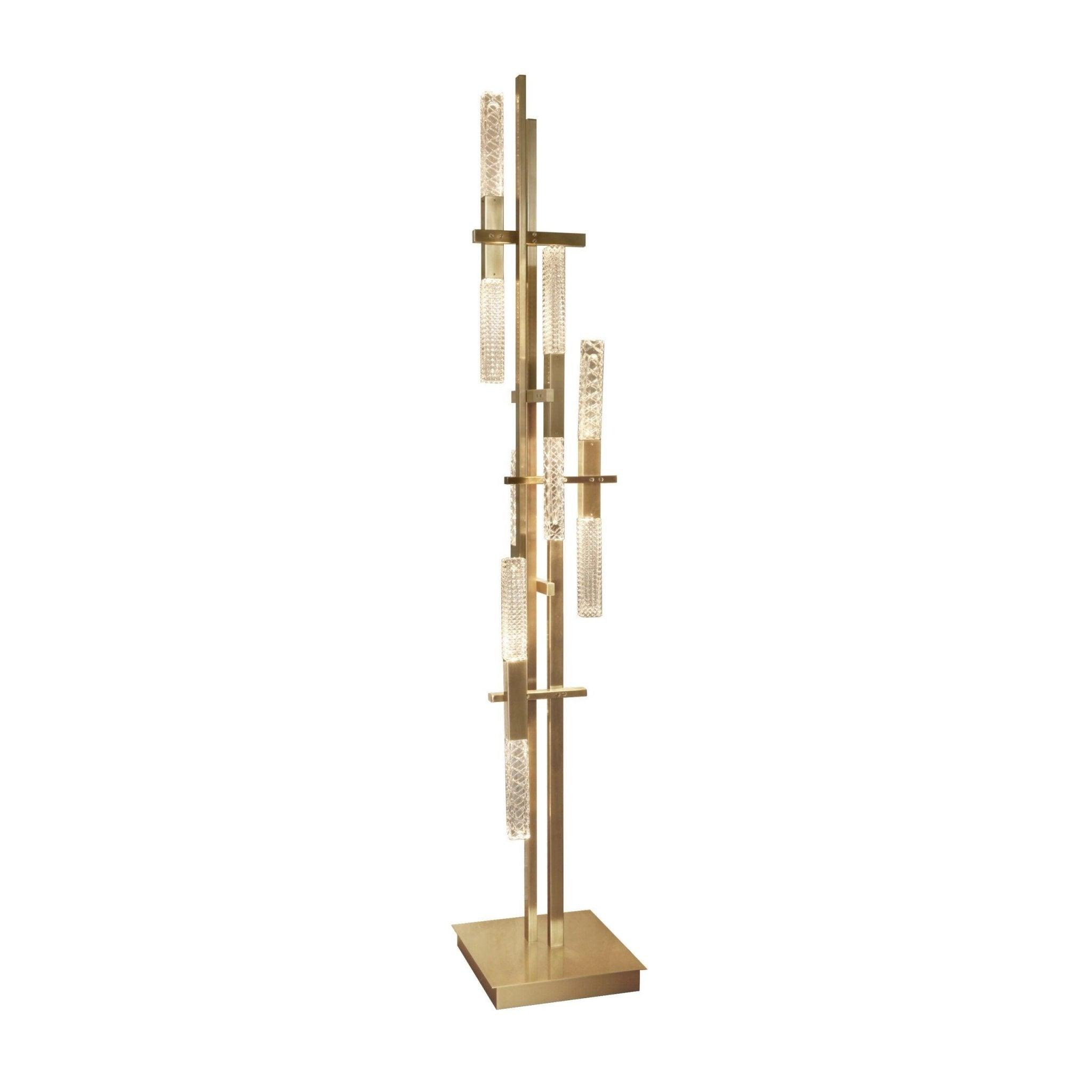 Die Kombination aus rechteckigen Messingrohren und schrägen Würfeln aus graviertem Kristall verleiht der Stehlampe Mikado einen Hauch von Stil.
