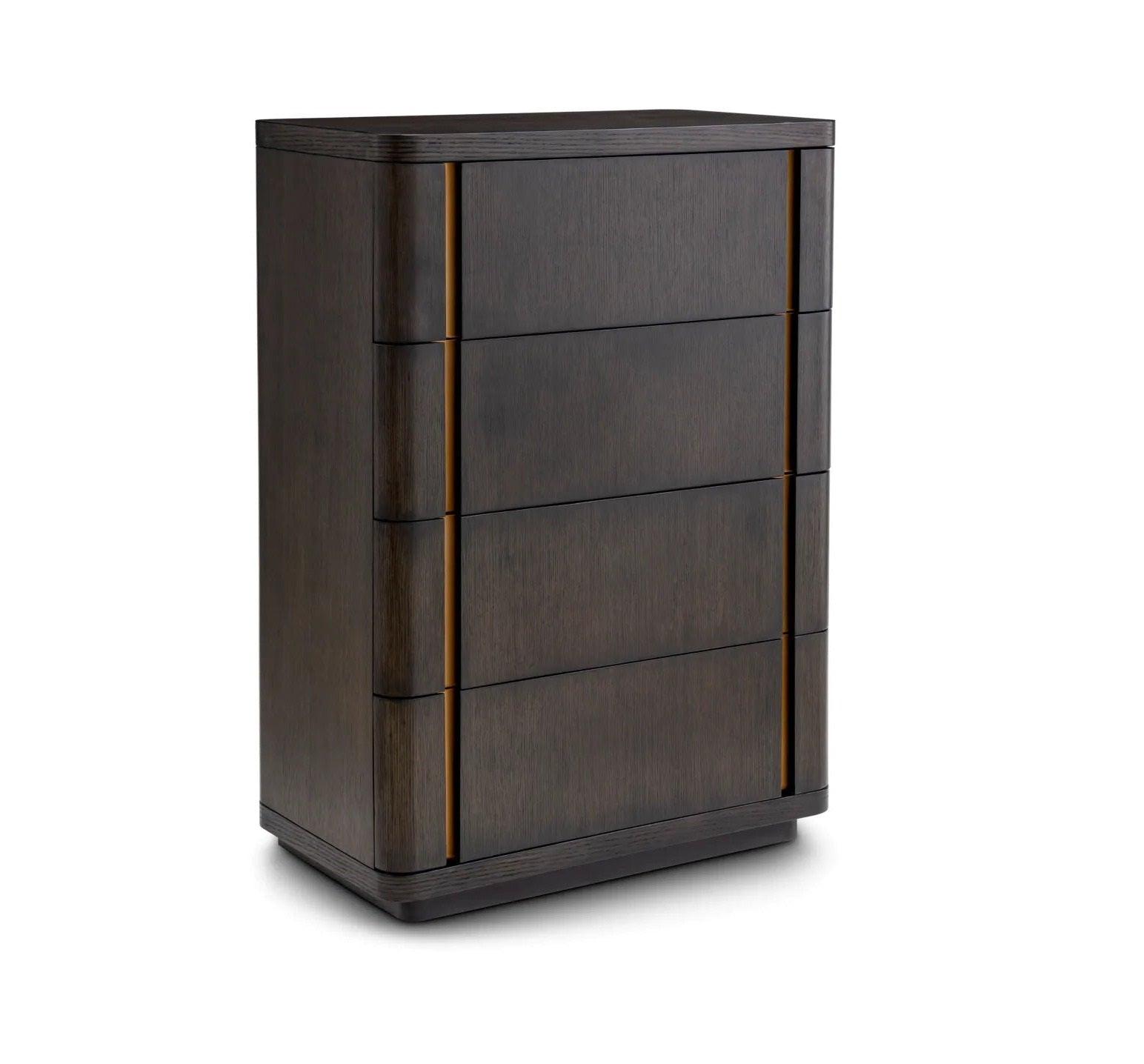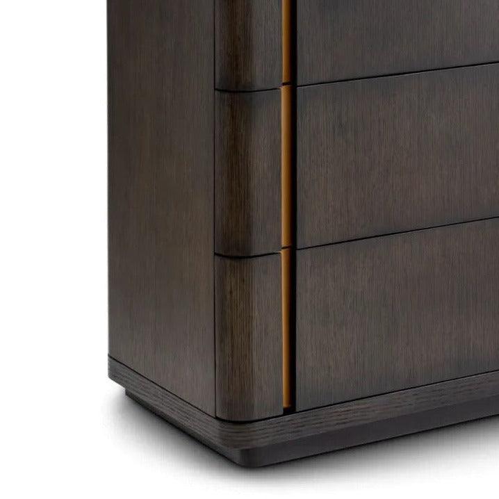 Die Kommode Modesto ist die perfekte Verbindung von traditioneller Handwerkskunst und modernem Design, was sie zu einem absoluten Must-Have für jeden Liebhaber eines raffinierten Stils macht. Ihr tiefes Mokka-Eichen-Finish zieht sofort die Blicke auf sich, während das zarte Finish aus gebürstetem Messing ihr einen einzigartigen Charakter und Klasse verleiht.