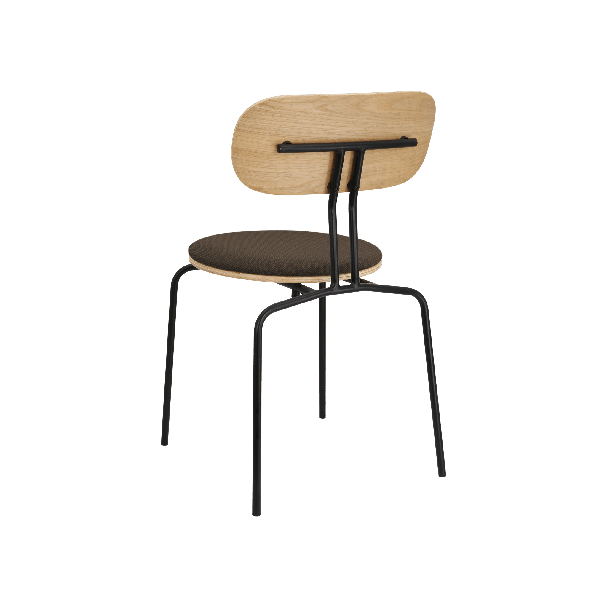 Stuhl Neugierig ist elegant, leichte und minimalistische Möbel aus Eichenfurnier. Es ist mit Messing- oder schwarzen Beinen erhältlich, und das optionale Sitzkissen bietet zusätzlichen Komfort. Sie können ein Kissen aus 17 Farben des Horizons -Stoffes auswählen, die 100% recycelt sind, sowie in einem braunen oder weißen Schatten mit Teddybärenstoff.