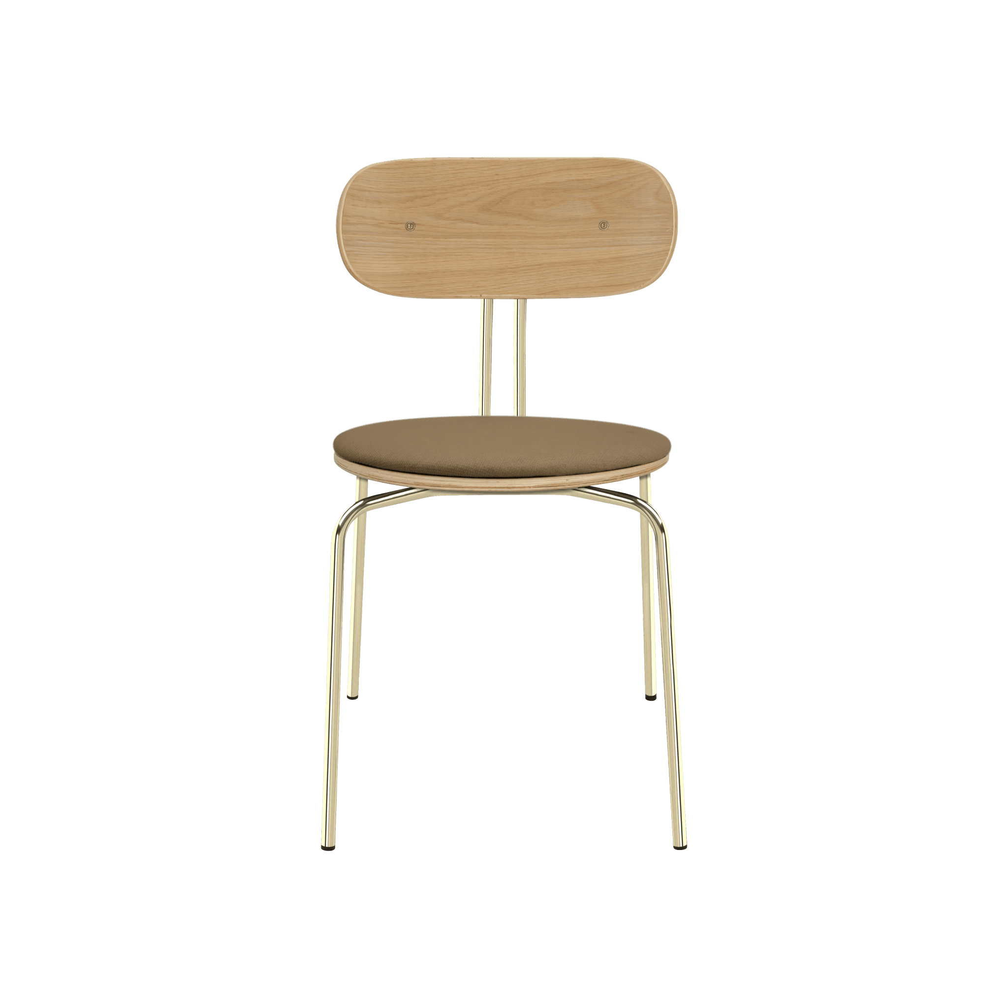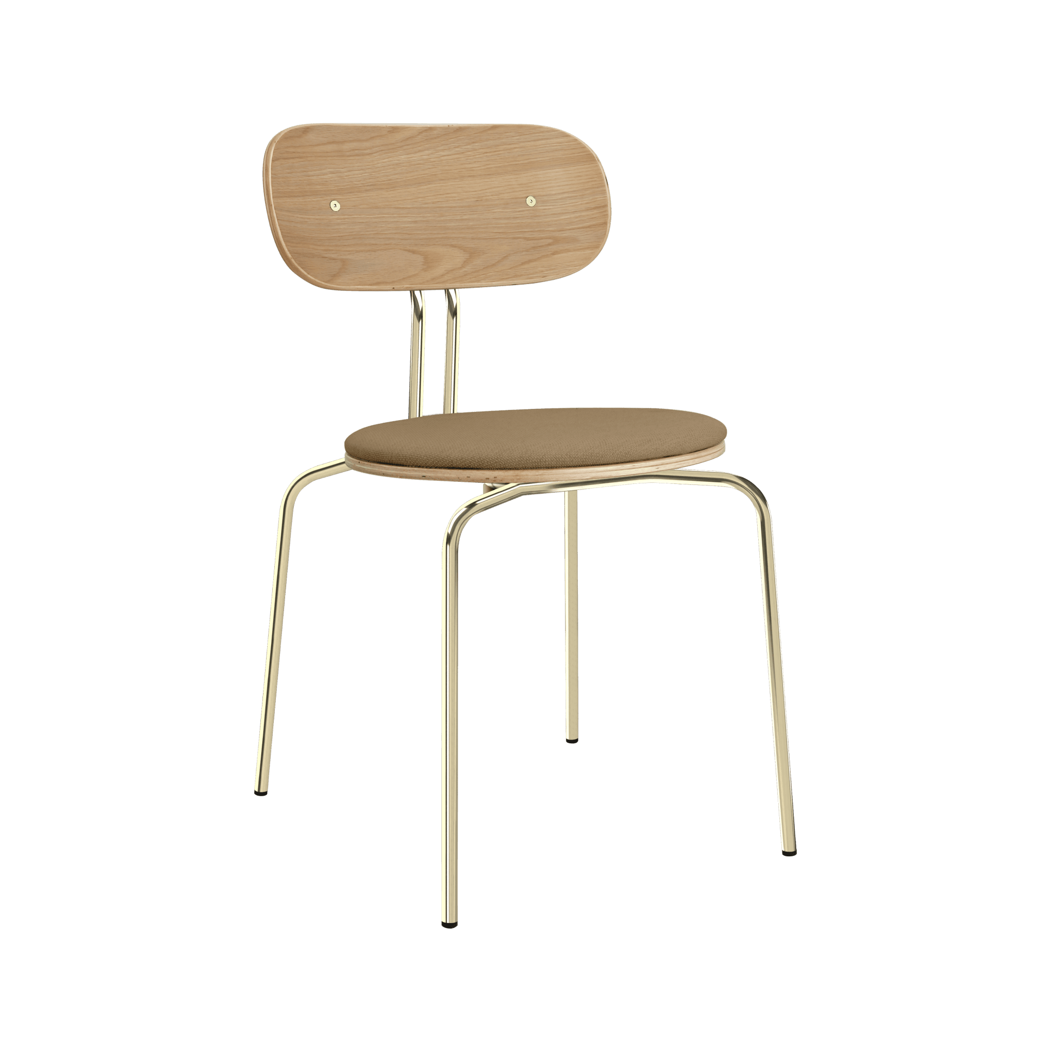 Stuhl Neugierig ist elegant, leichte und minimalistische Möbel aus Eichenfurnier. Es ist mit Messing- oder schwarzen Beinen erhältlich, und das optionale Sitzkissen bietet zusätzlichen Komfort. Sie können ein Kissen aus 17 Farben des Horizons -Stoffes auswählen, die 100% recycelt sind, sowie in einem braunen oder weißen Schatten mit Teddybärenstoff.