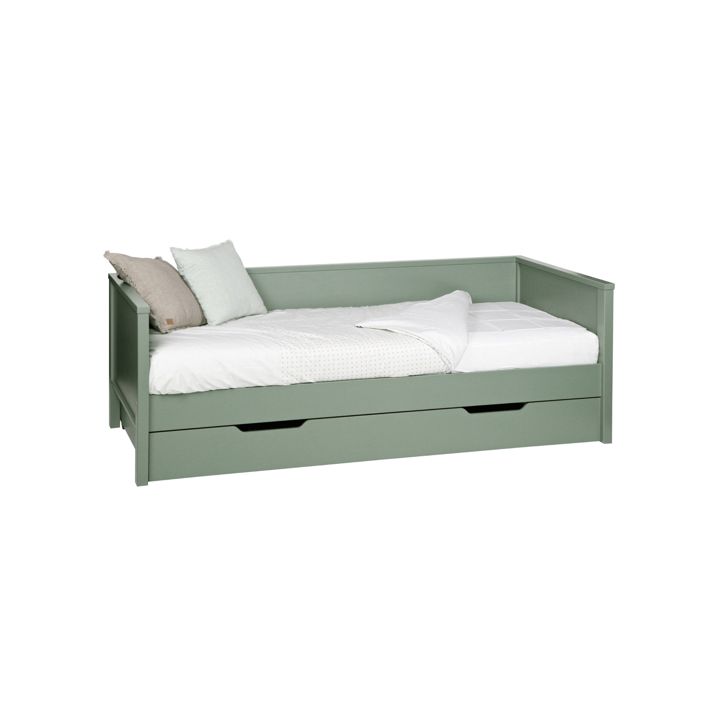 Bett mit Rückenlehne Nikki in grüner Farbe ist die ideale Kombination aus Einfachheit, Funktionalität und skandinavischem Stil. Dank seiner kompakten Größe eignet es sich hervorragend für kleinere Räume und verleiht ihnen Leichtigkeit und einen Hauch von Frische. Das Bett wurde aus hochwertigem Holz gefertigt, das Langlebigkeit garantiert.