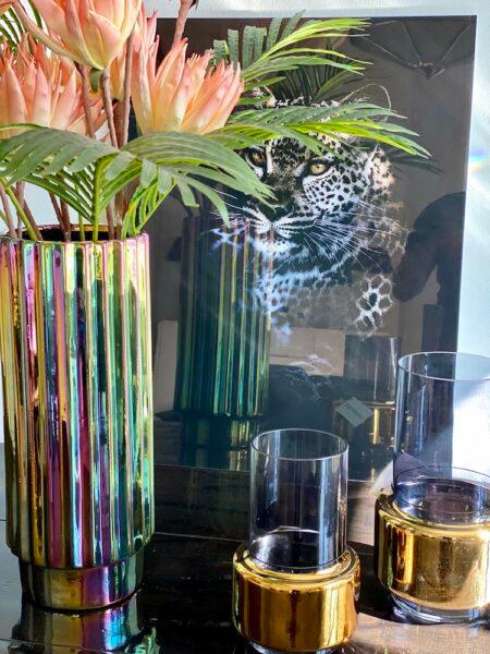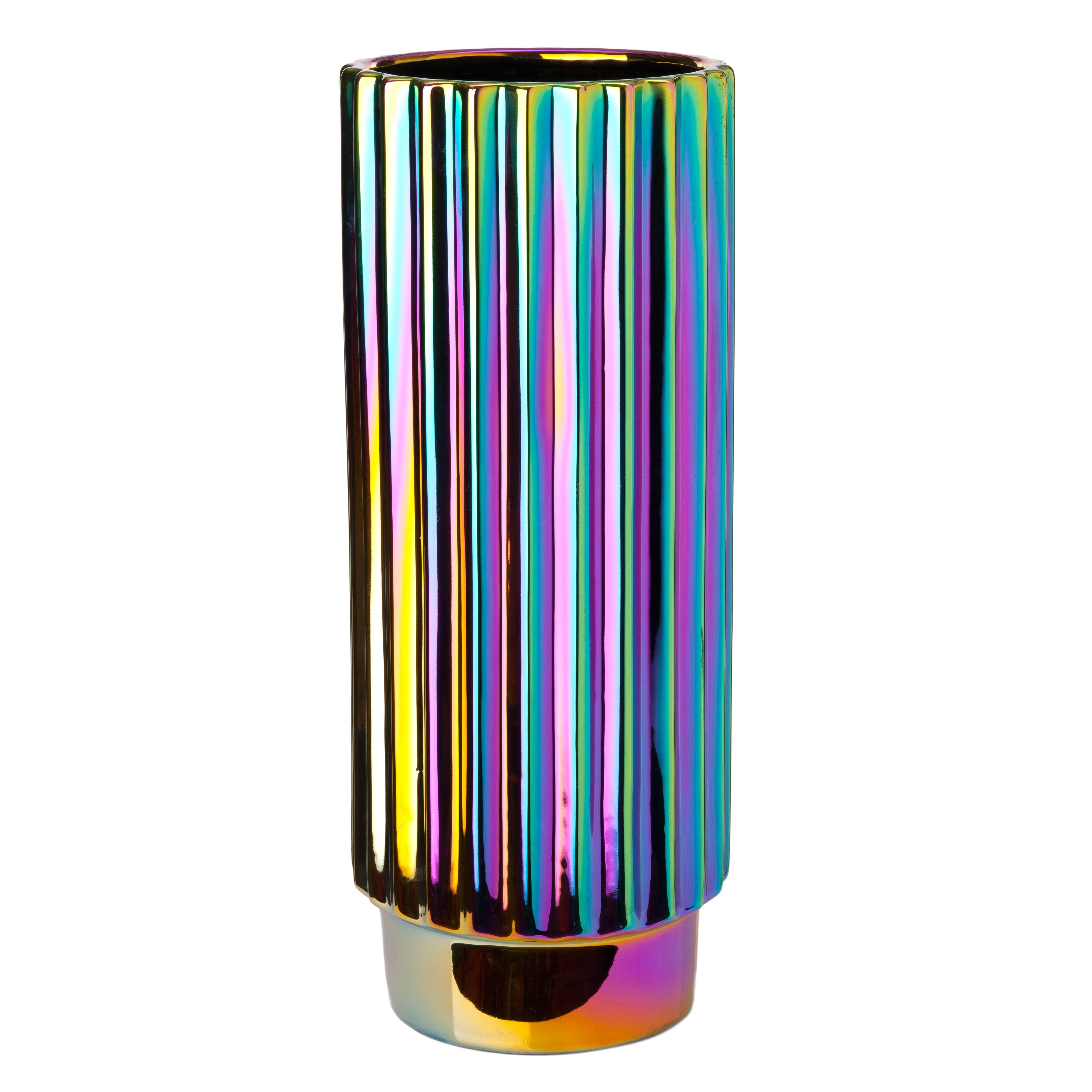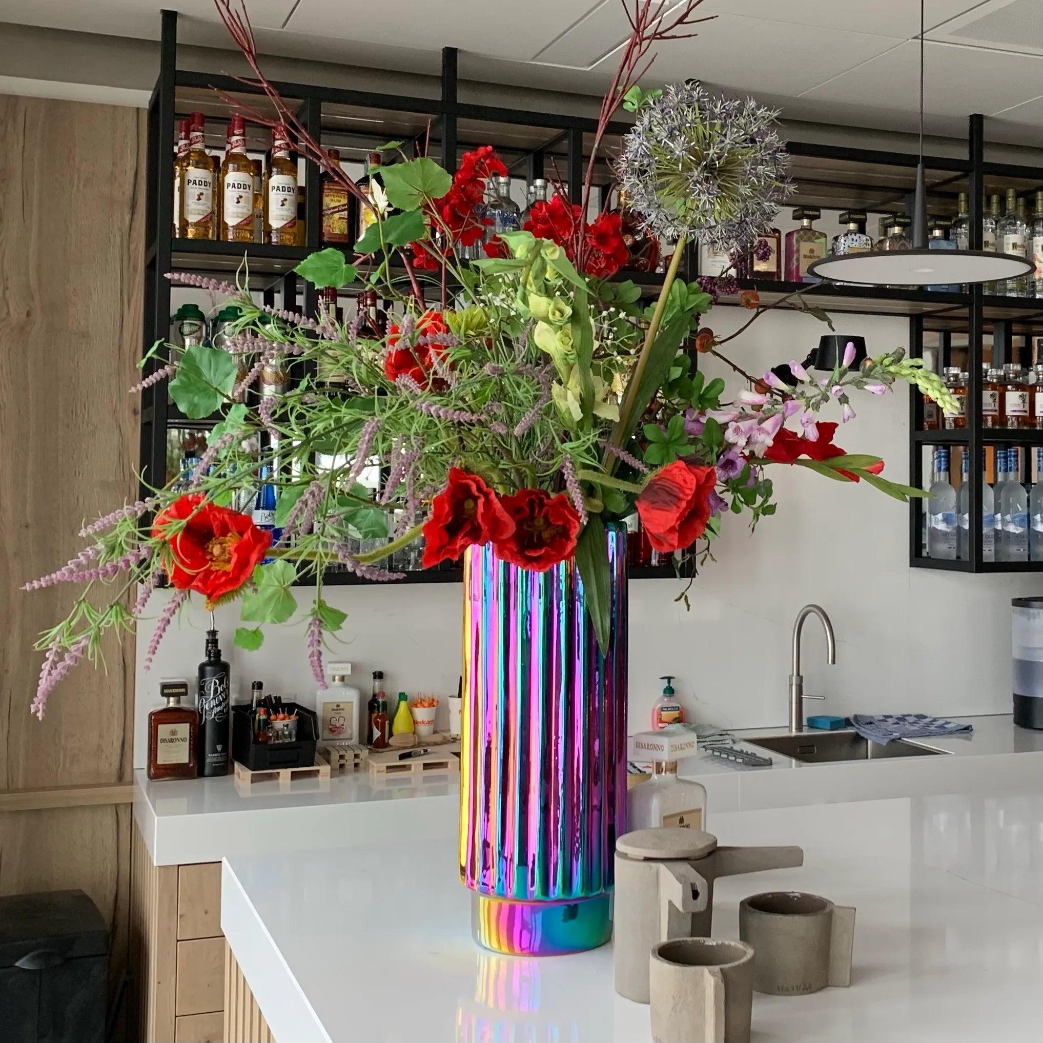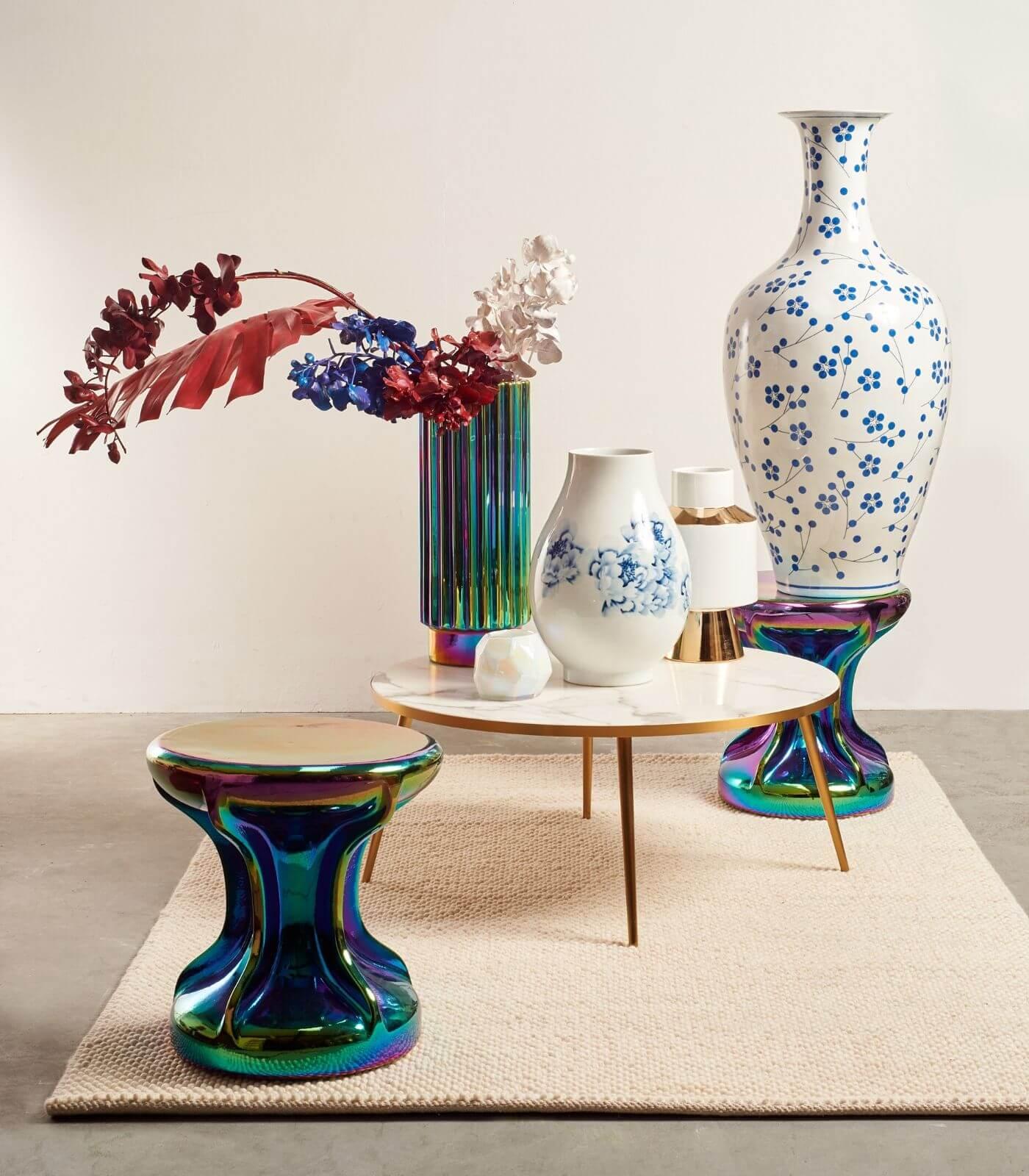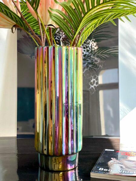 Vase Oily Folds ist ein Modell, das mit seinem Aussehen überrascht und an den charakteristischen Spritzer Benzin erinnert, der in einer Pfütze Wasser versinkt. Die unregelmäßige Form verstärkt diesen außergewöhnlichen Eindruck, da die Sonnenstrahlen auf verschiedene Flächen fallen und die elegante Farbvielfalt zusätzlich betonen.