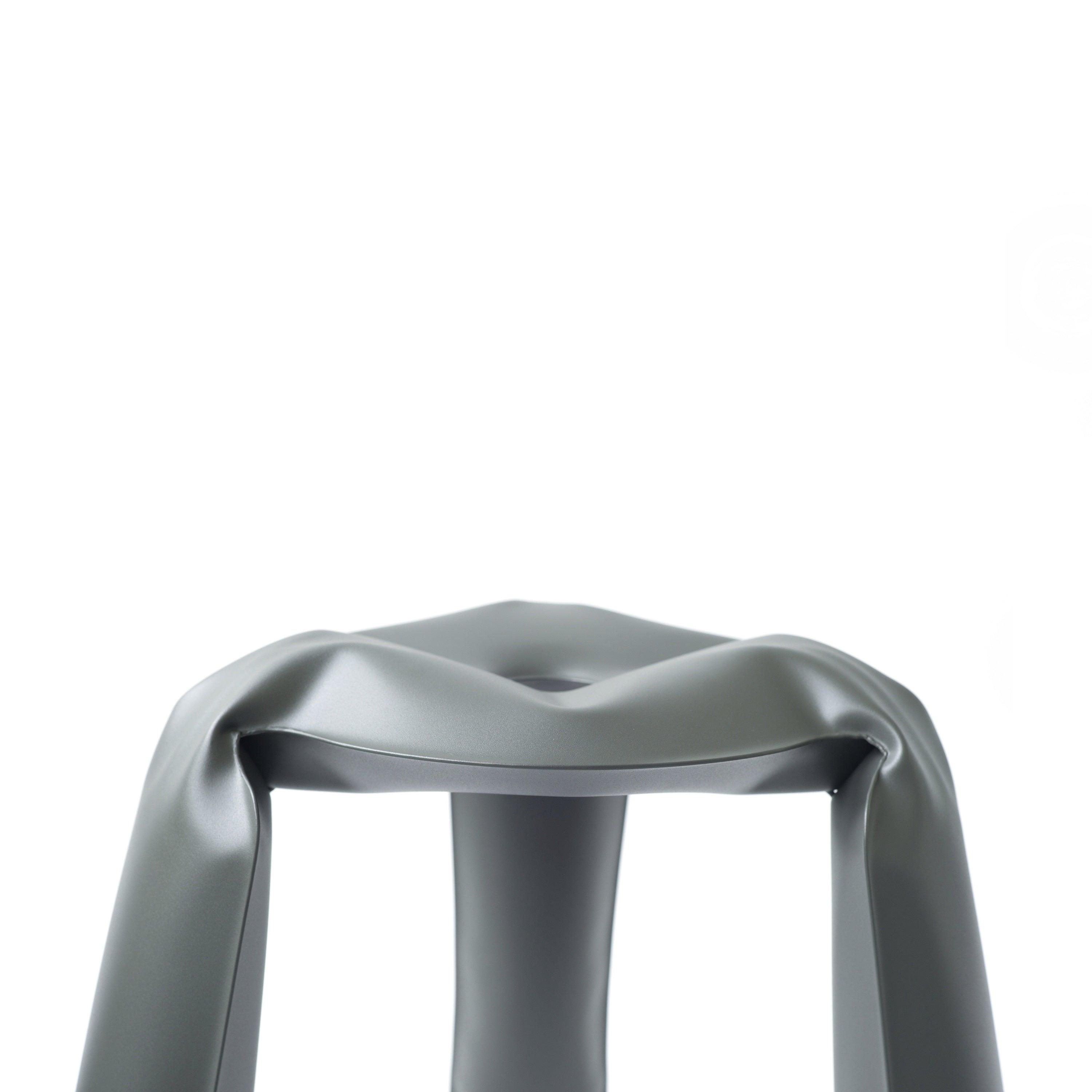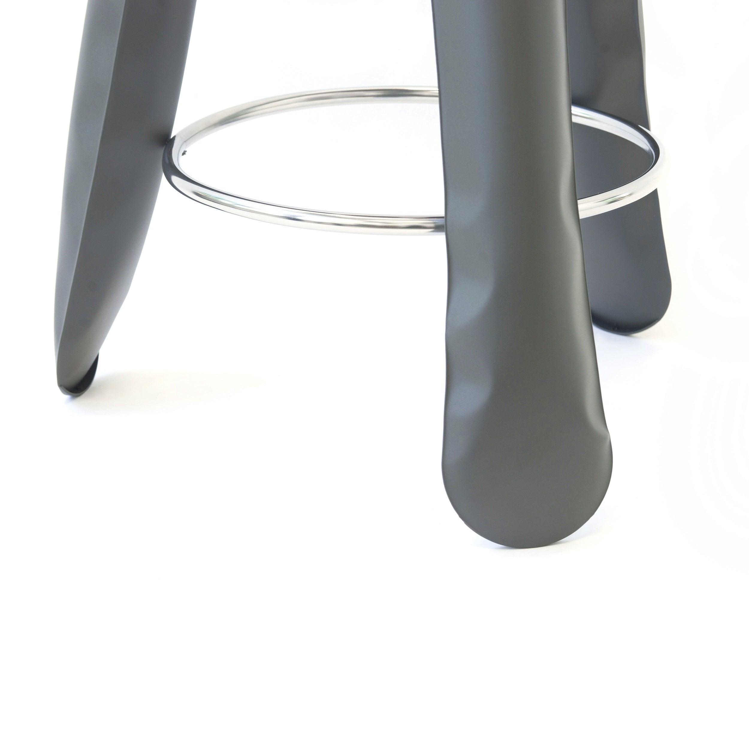 Barhocker Plopp in der Farbe Dunkelgrau ist ein wahres Aushängeschild von Zieta Studio und gleichzeitig ein Symbol für Oskar Ziętas Forschungen zu den Eigenschaften und Möglichkeiten von Metall. Dieser außergewöhnliche Hocker, auch bekannt als "Polnisches Luftdruckobjekt", ist ein hervorragendes Beispiel dafür, wie künstlerische Aspekte des Designs durch hochentwickelte Ingenieurformen offenbart werden können.