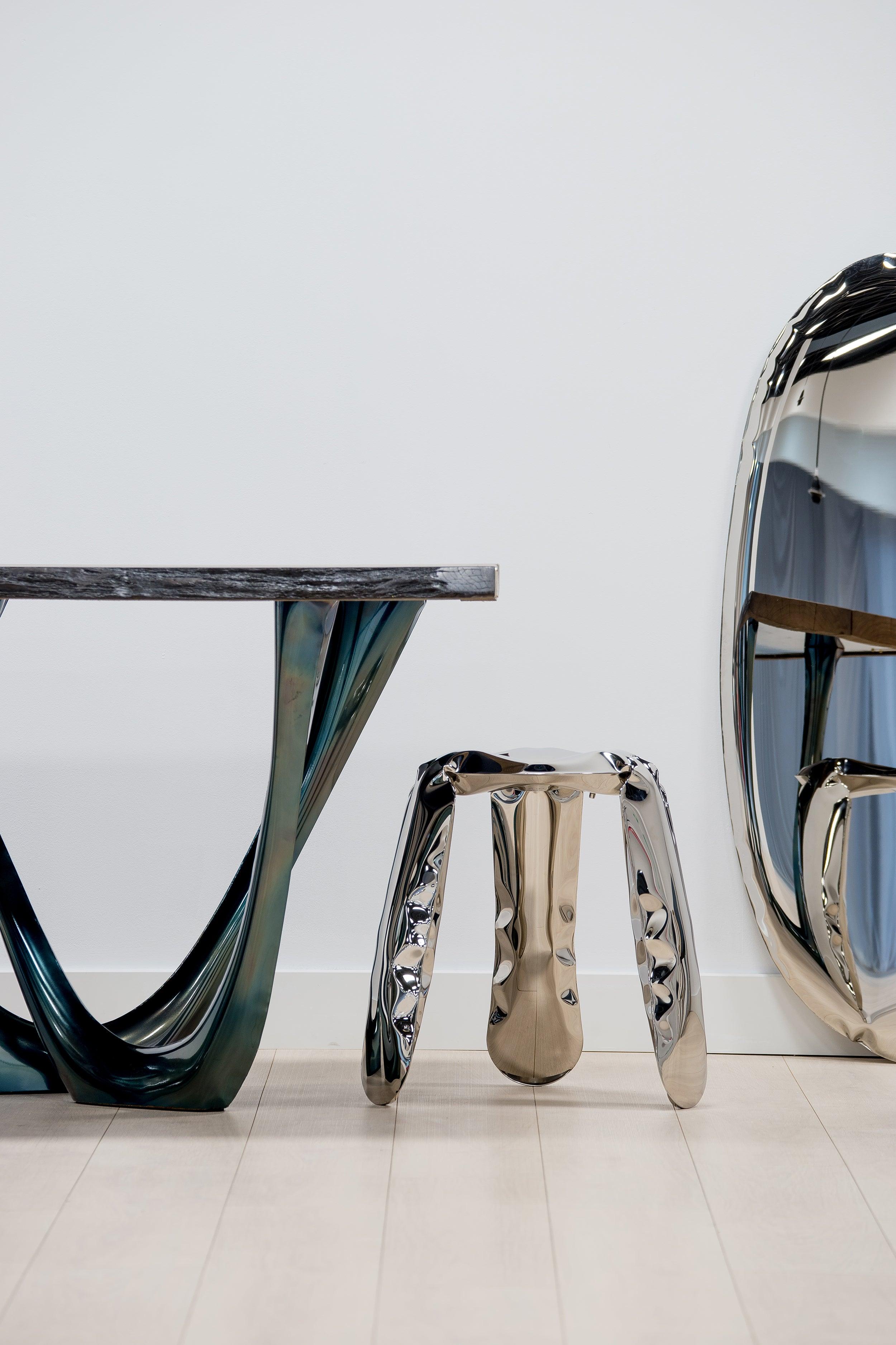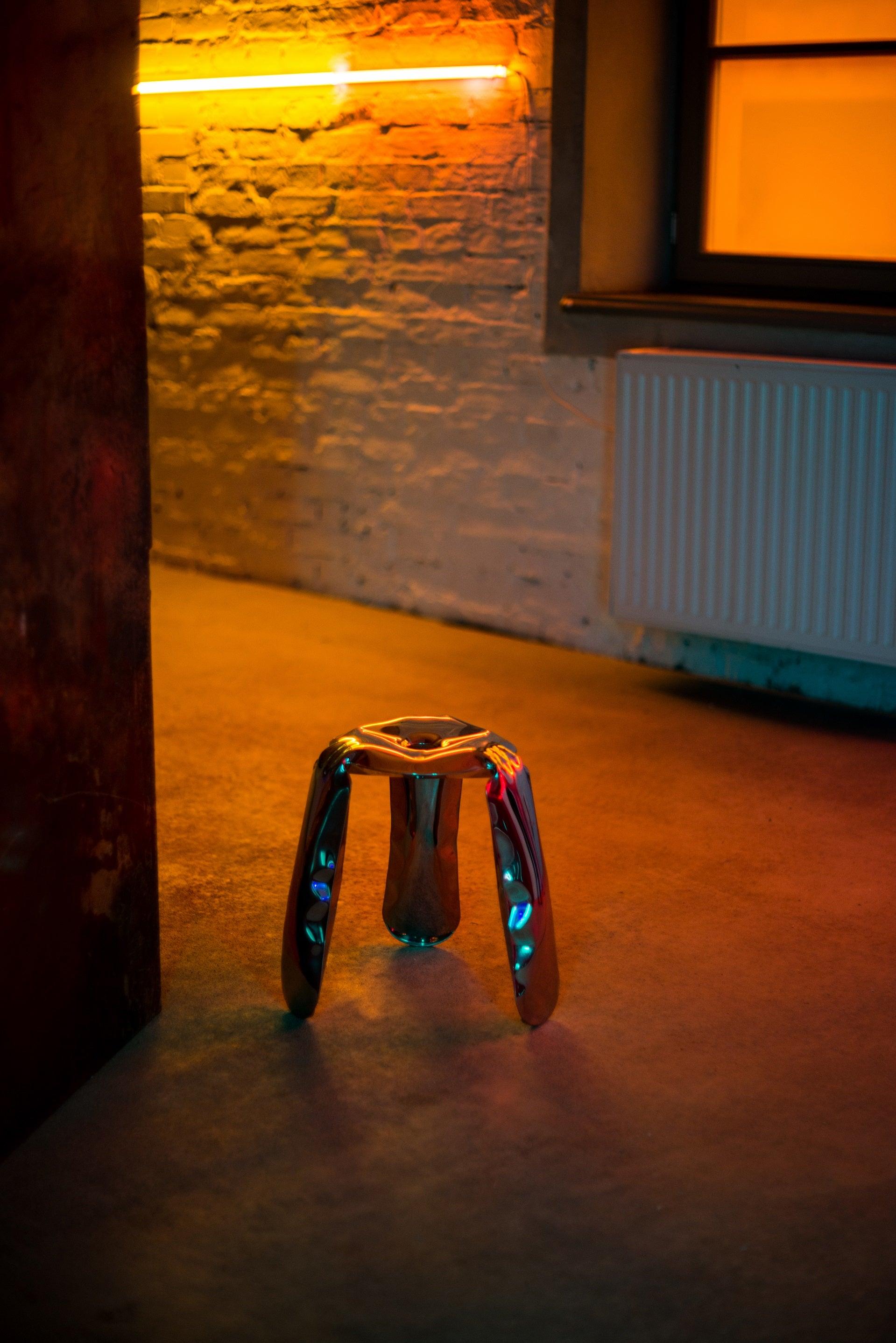 Plopp ist nicht nur ein Möbelstück, sondern auch ein Manifest der FiDU-Technologie (Freie Innendruck Umformung) und des Prozesses der "kontrollierten Verlustkontrolle". Der Hocker wurde aus zwei ultradünnen Stahlblechen gefertigt, die an den Kanten miteinander verschweißt und dann unter hohem Druck aufgeblasen werden. Durch diesen Prozess wird die flache 2,5D-Form in ein dreidimensionales Objekt deformiert, was dem Hocker außergewöhnliche Formen und ein dynamisches Aussehen verleiht.