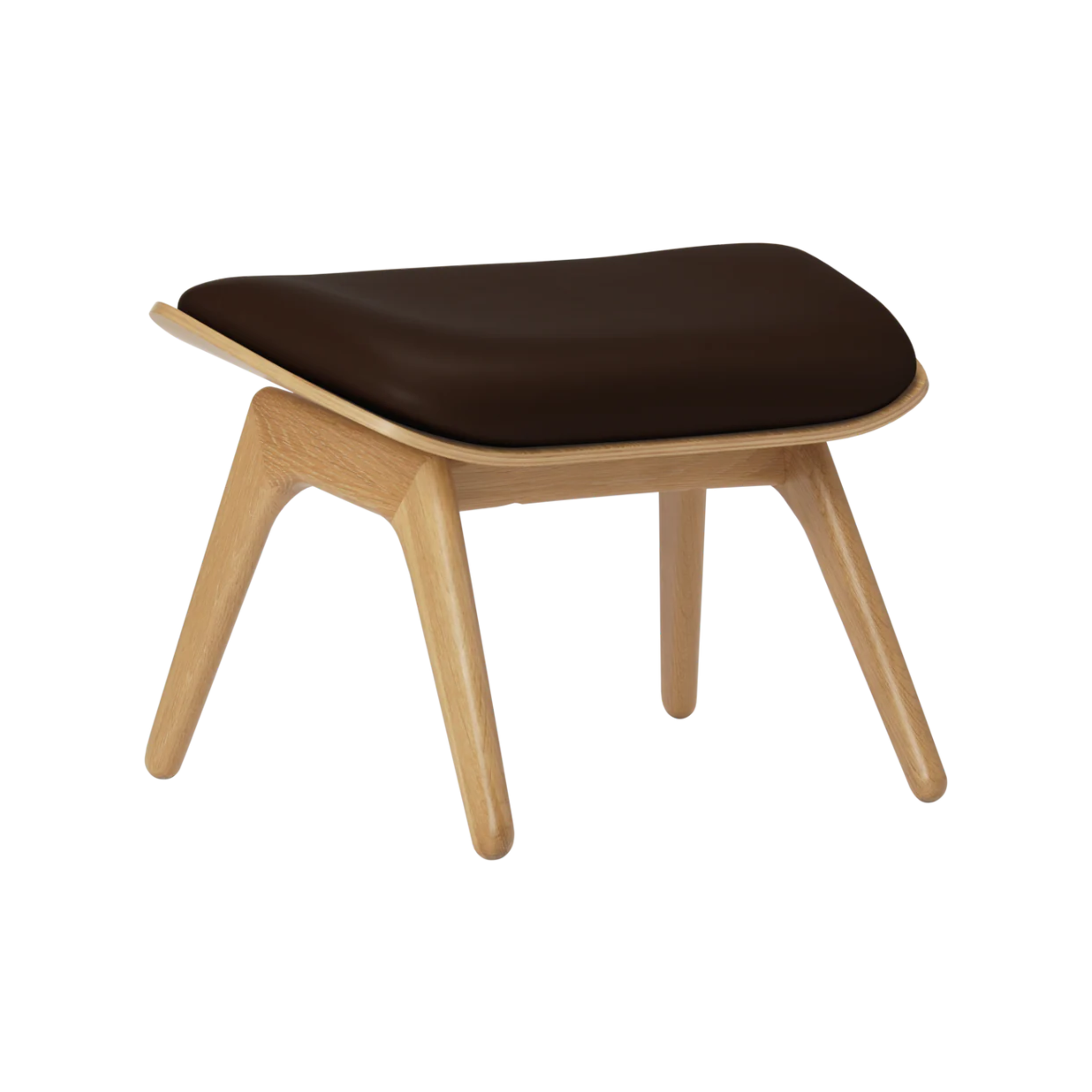 Die Form des Sitzkissens wurde so gestaltet, dass sie die Holzschale des Fußhockers leicht enthüllt und elegante Details sowie die Handwerkskunst betont. Die Lederpolsterung verleiht dem Ganzen einen außergewöhnlichen Charakter und zeitlose Klasse. Die matte, warm anfühlende Oberfläche des Leders mit natürlicher Textur altert schön und gewinnt mit der Zeit noch mehr Charme.