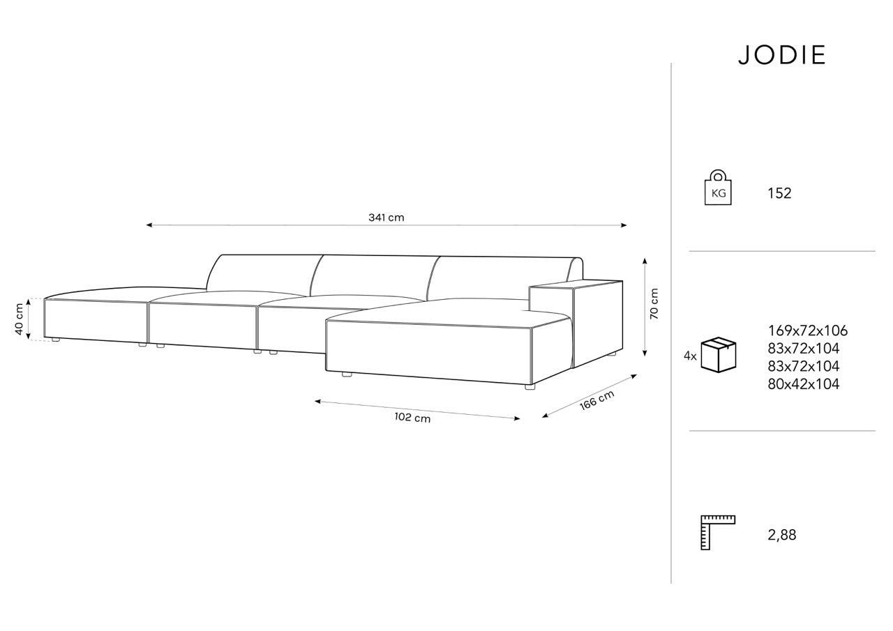 Jodie ist ein geräumiges fünf Personen Ecksofa. Dieses Sofa ist die ideale Wahl für diejenigen, die nicht nur Funktionalität, sondern auch ein stilvolles Aussehen ihres Interieurs schätzen. Der Samtstoff verleiht dem Sofa ein elegantes und stilvolles Aussehen und sorgt gleichzeitig für Weichheit und Komfort während der Nutzung.