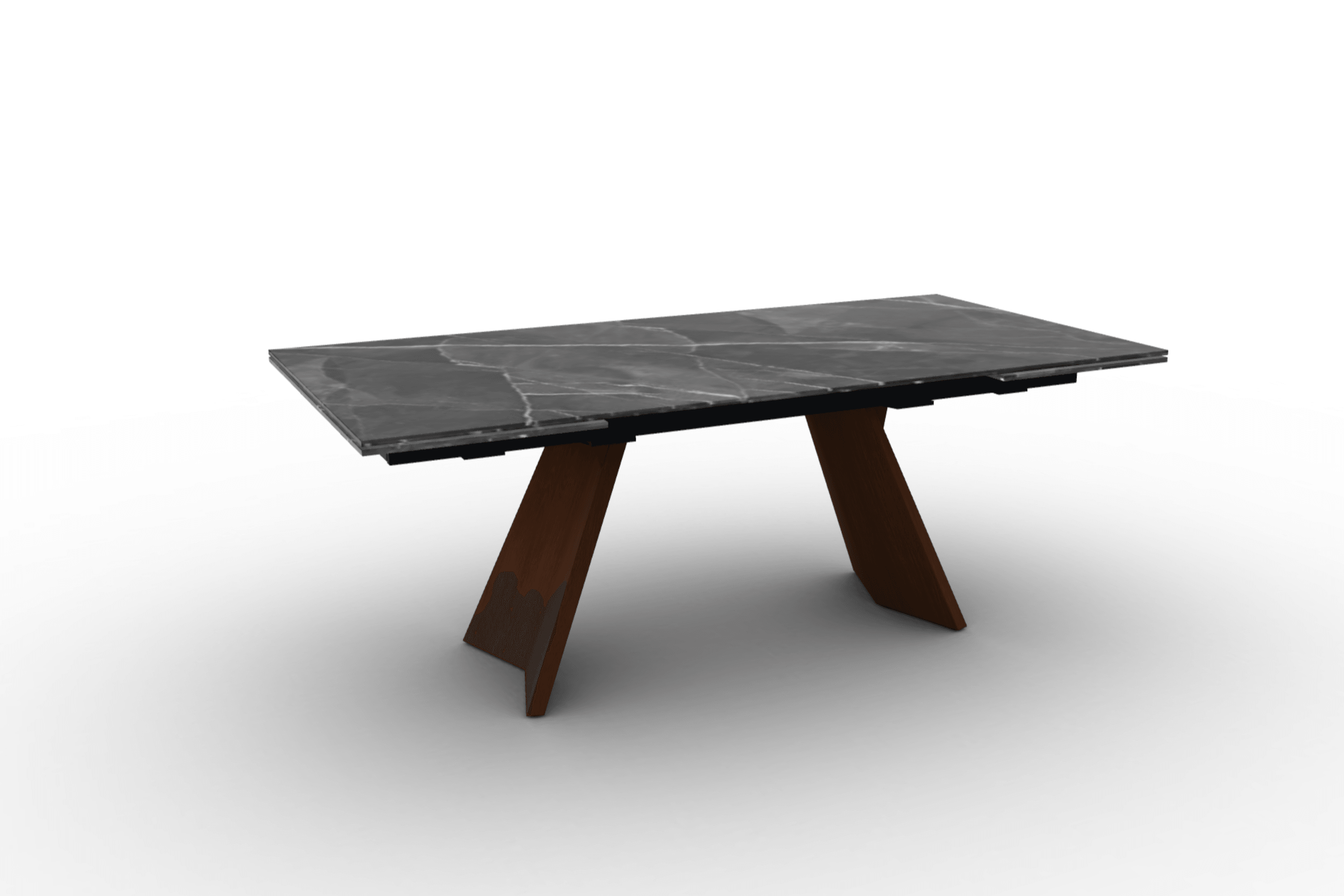 Icaro es Tisch mit einem Keramikoberteil und dem Bau einer Basis aus furniertem Holz.