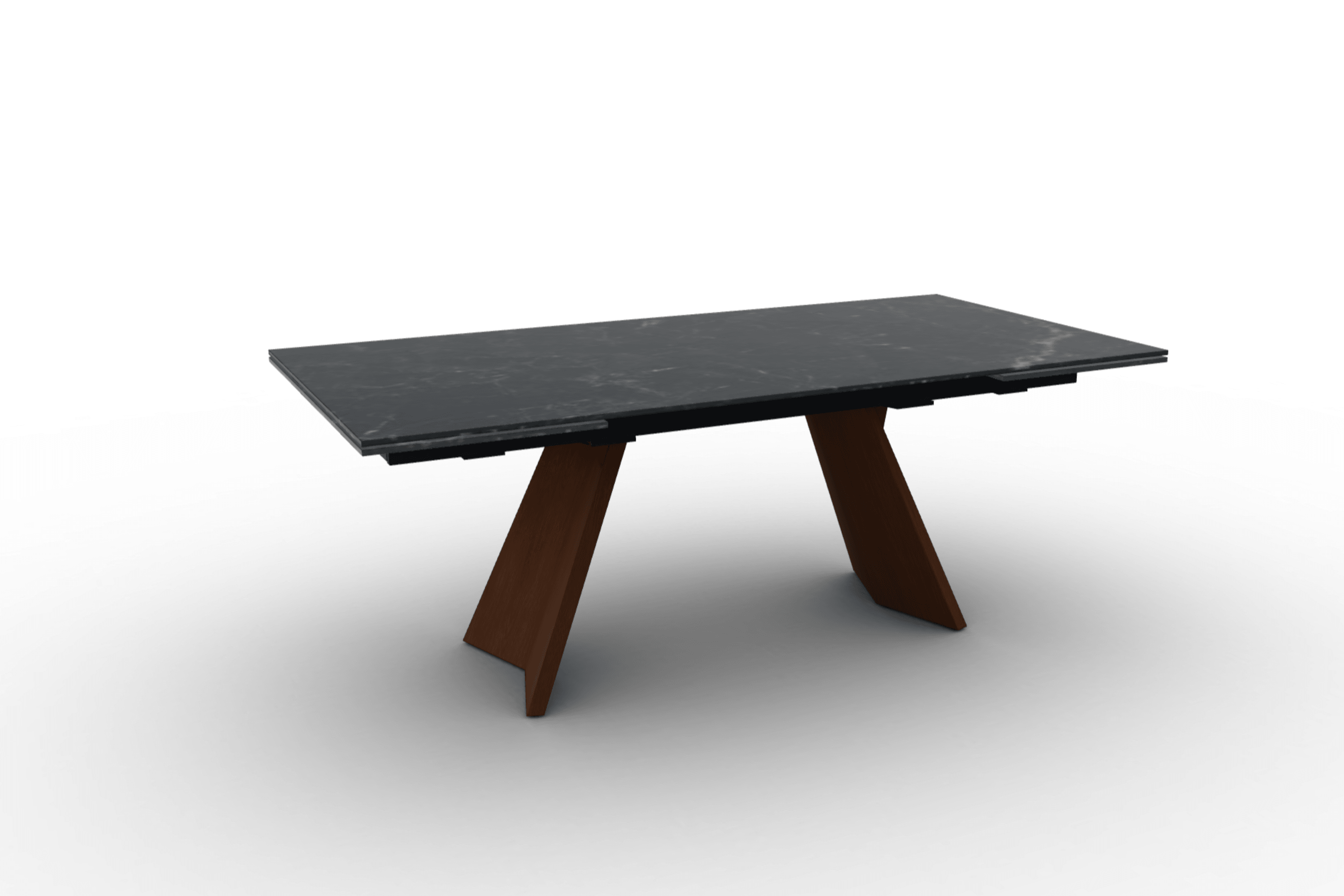 Icaro es Tisch mit einem Keramikoberteil und dem Bau einer Basis aus furniertem Holz.