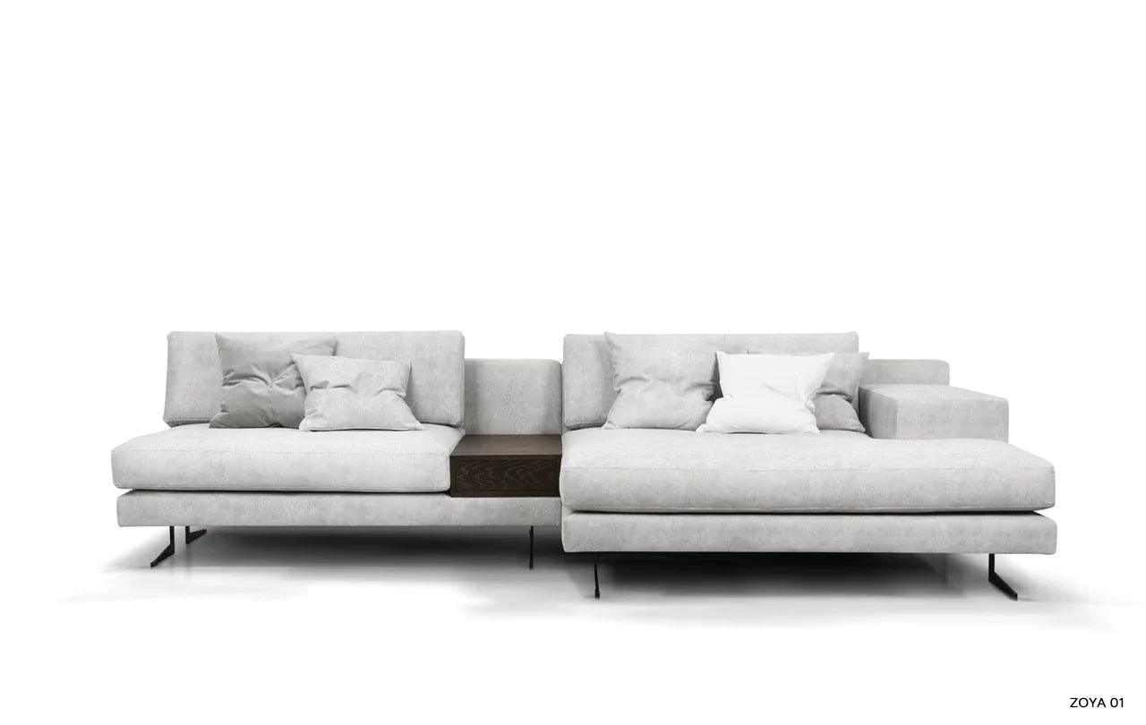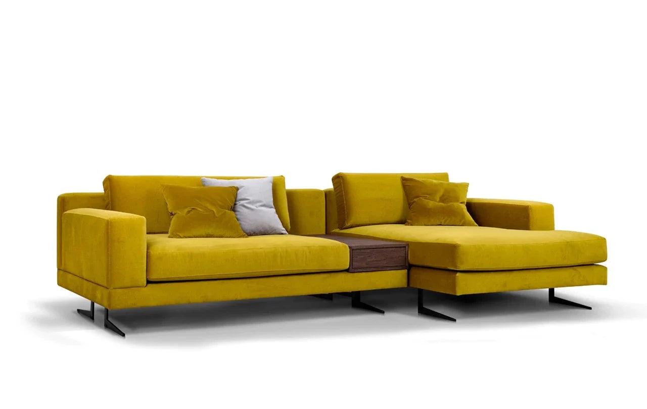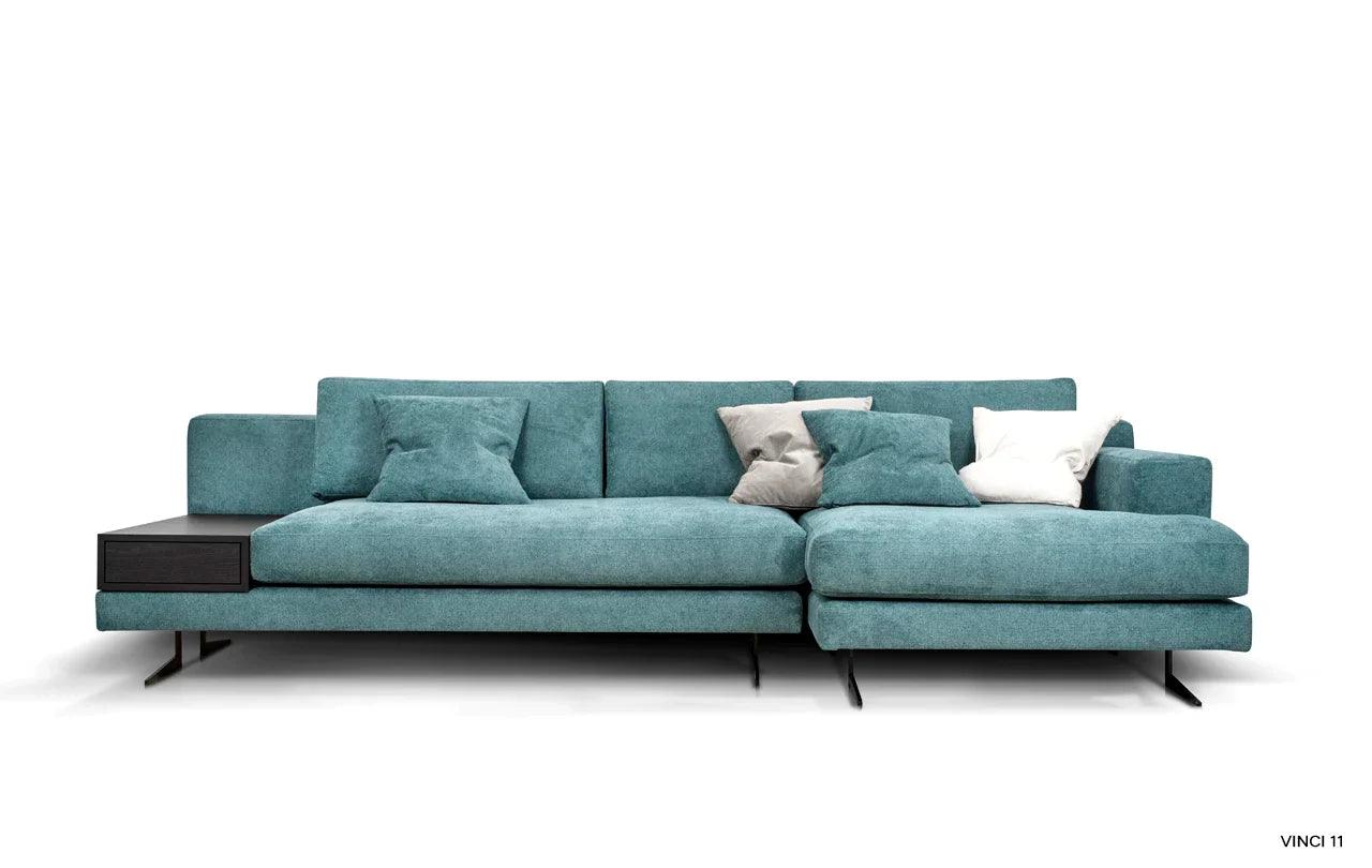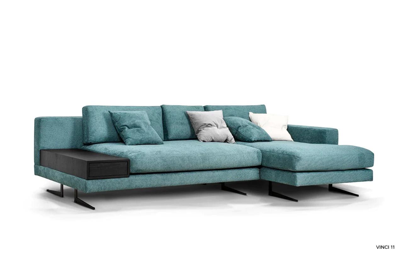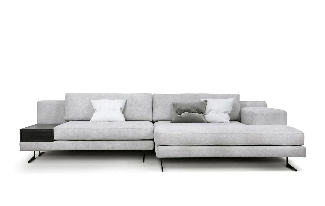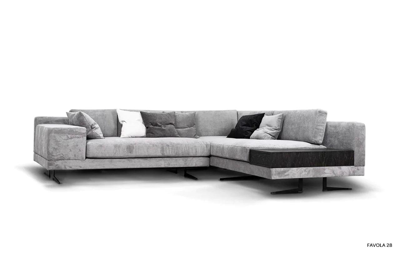 Eines der besonderen Elemente des Designs ist die Möglichkeit, eines der Kissen der Eckcouch in einen praktischen Tisch zu verwandeln. Diese Funktionalität ermöglicht es, einen Platz für eine Tasse Ihres Lieblingsgetränks oder eine Nachttischlampe zu schaffen und verleiht der Eckcouch eine zusätzliche Dimension der Nutzbarkeit.
