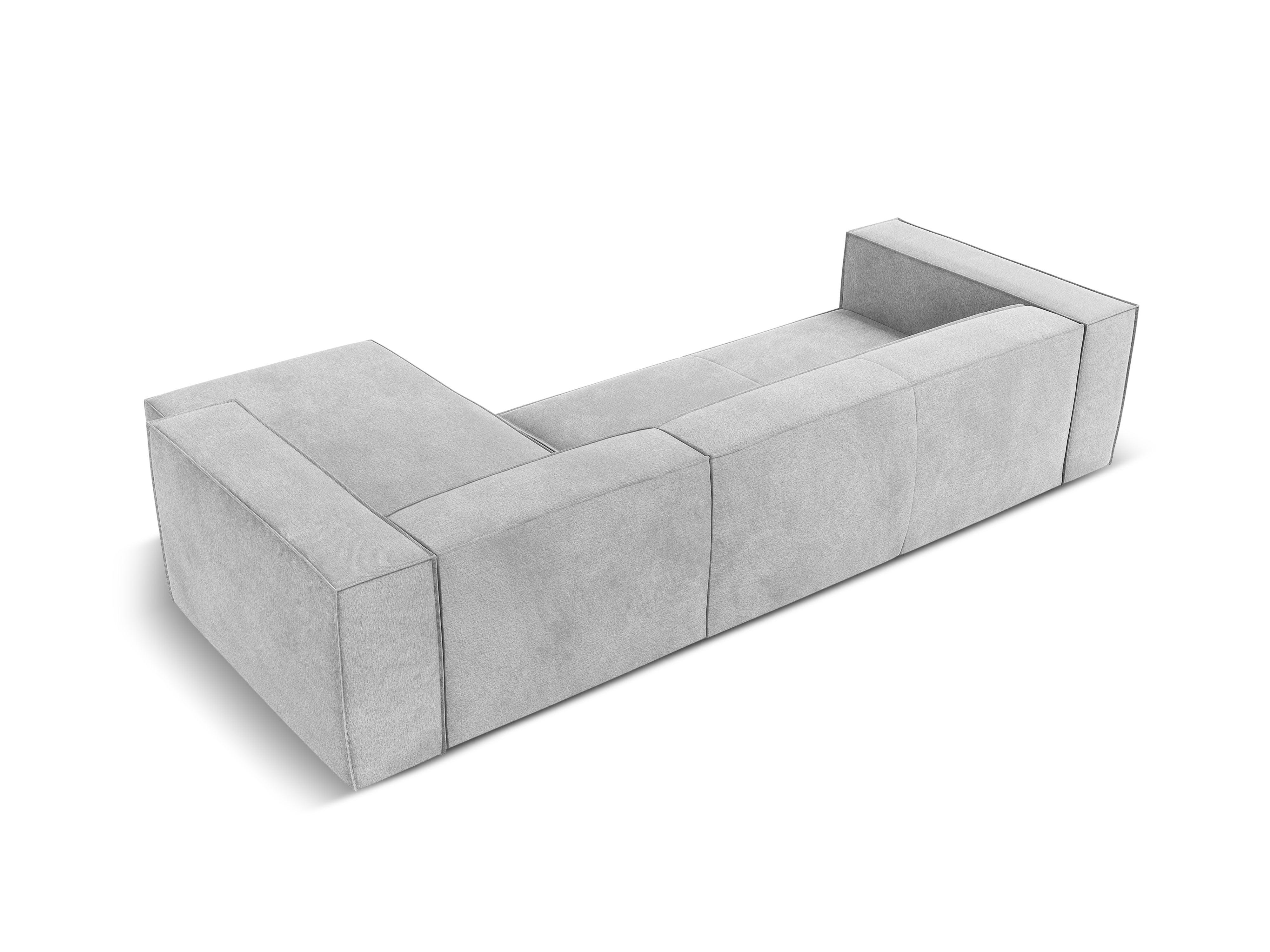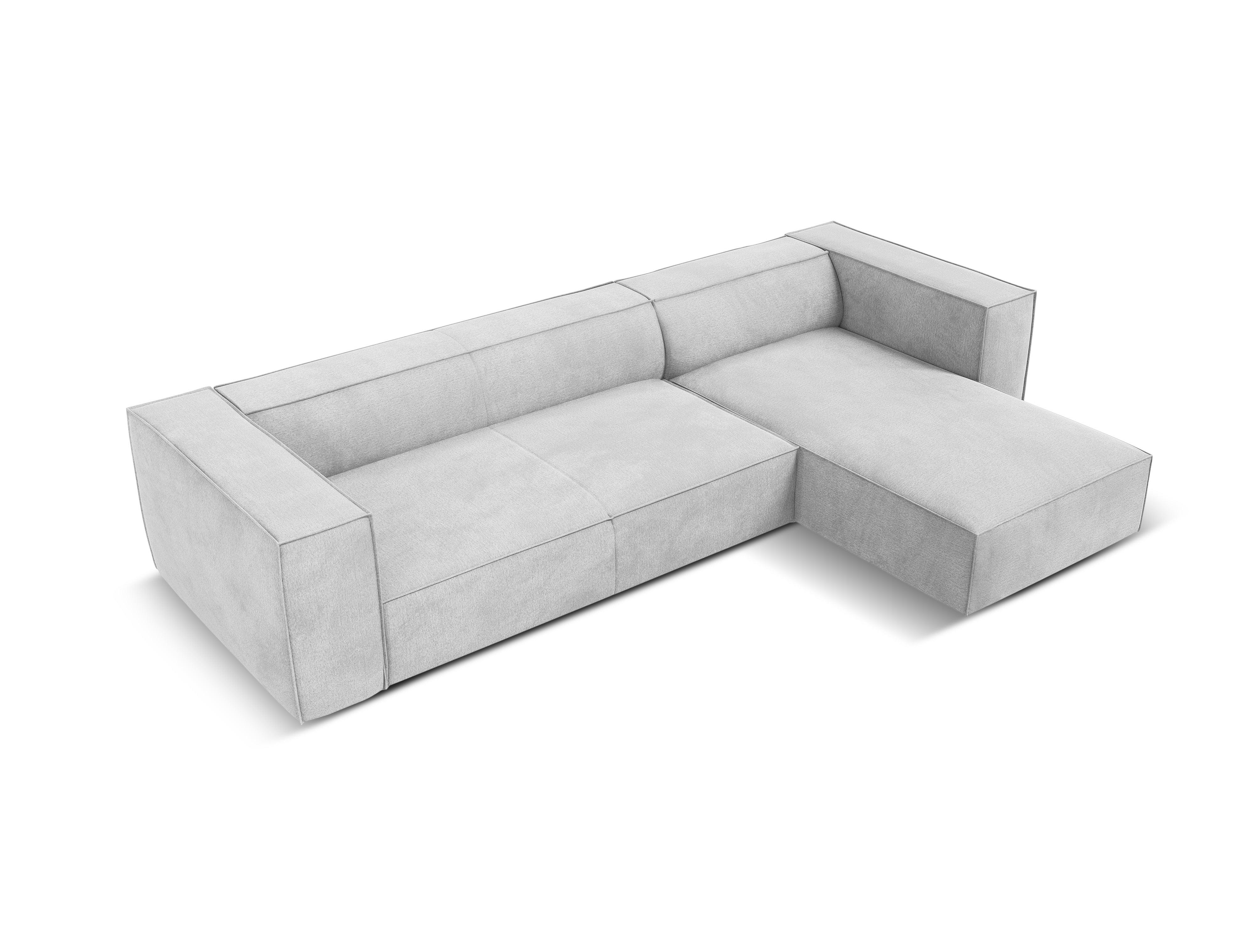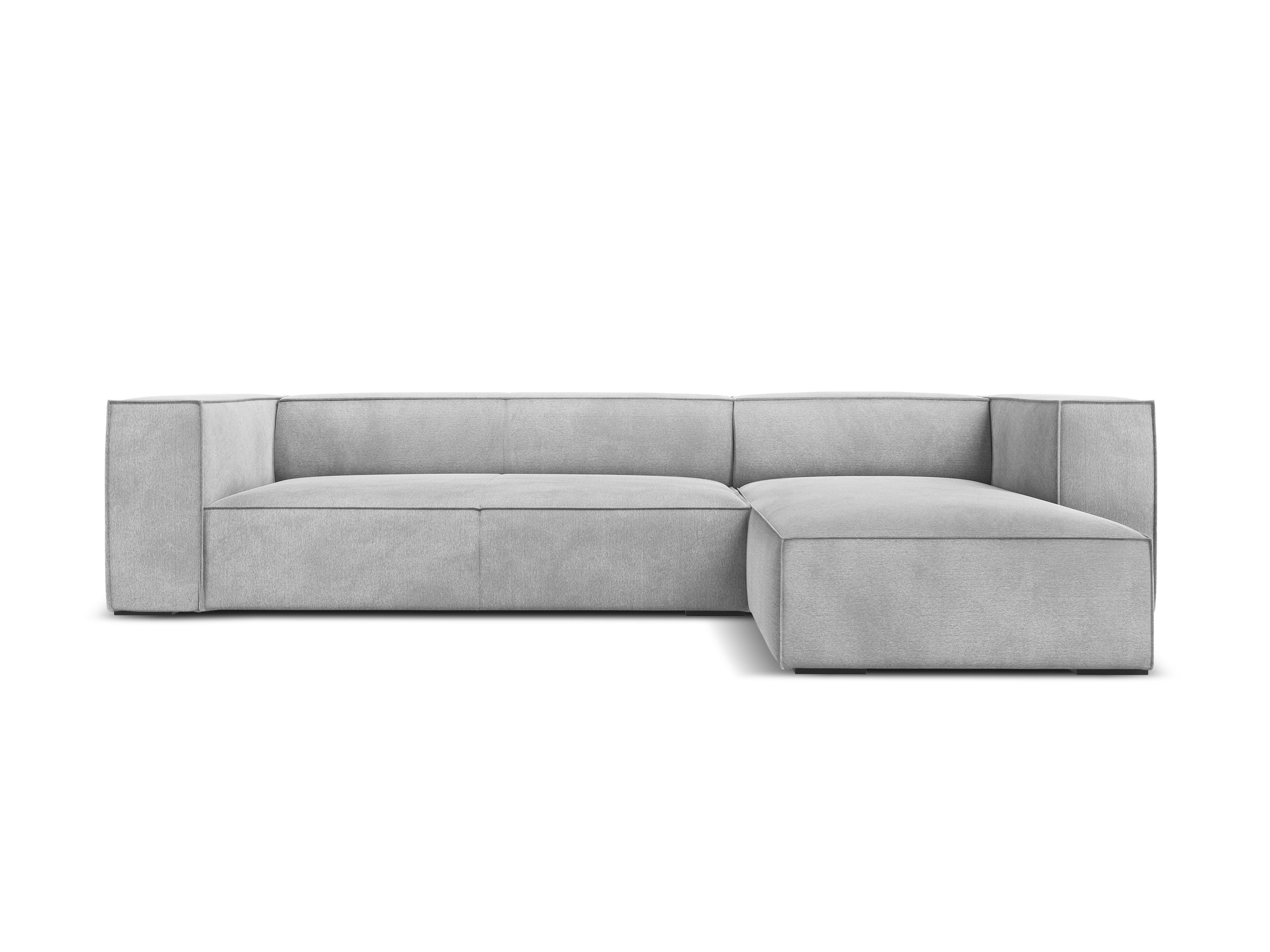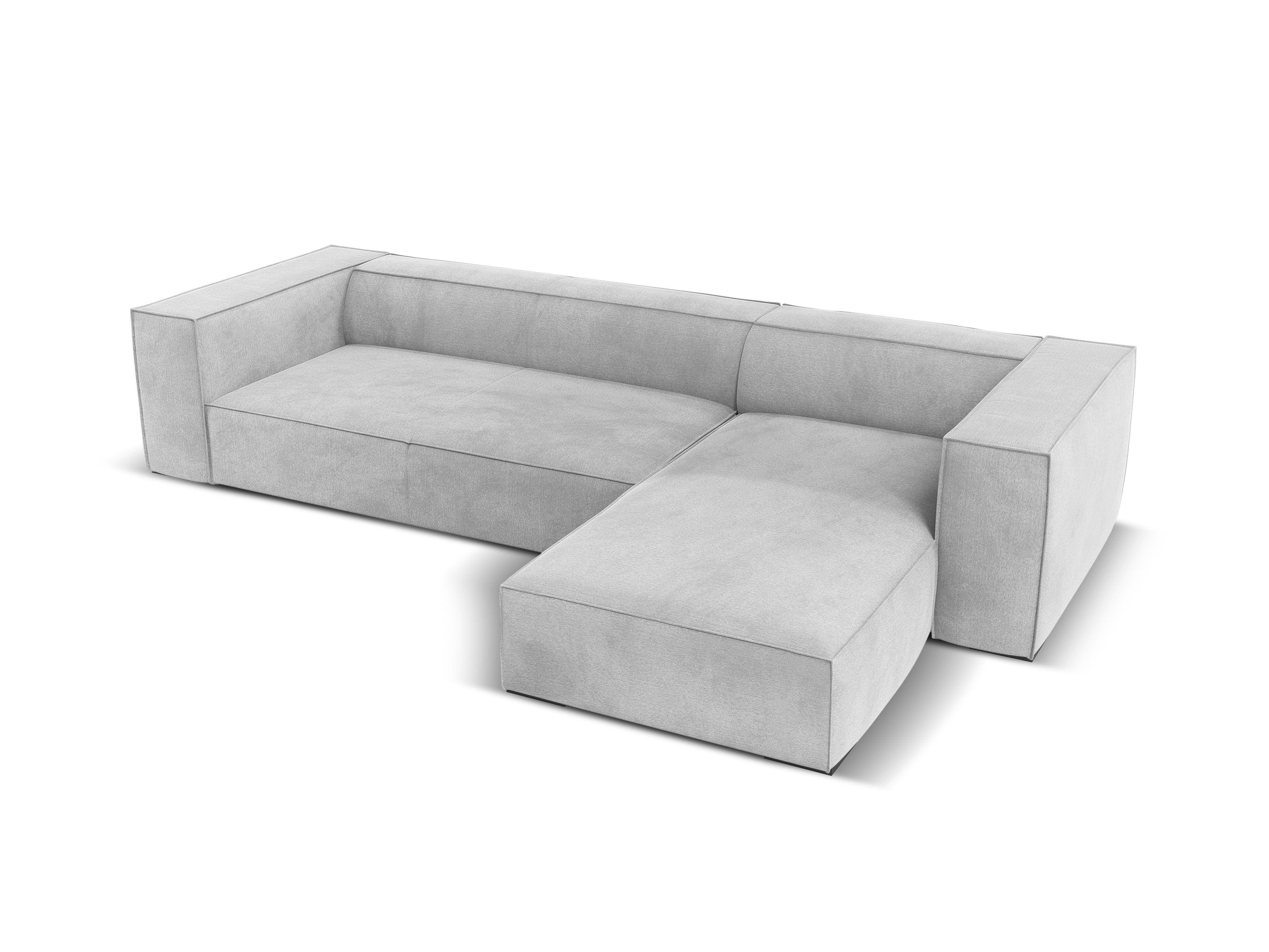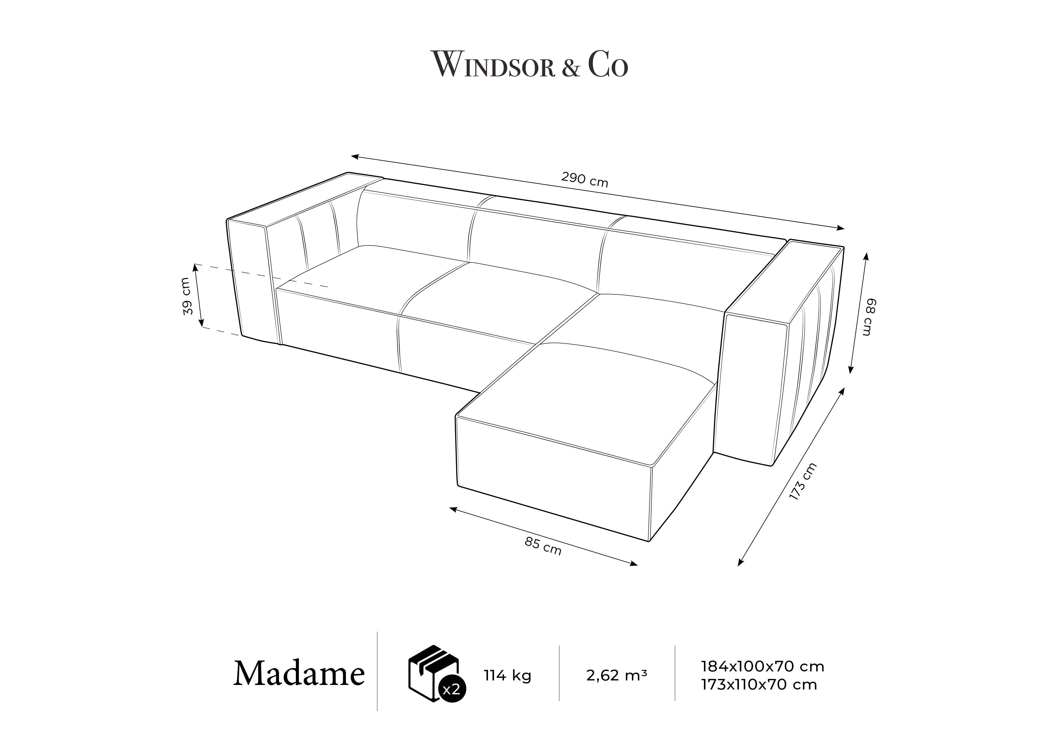 Ecksofa für vier Personen Madame mit ihrem markanten Charakter und eleganten Finish ist die perfekte Wahl für ein modernes Wohnzimmer. Die tiefe Sitzfläche ist sowohl ideal für gesellige Zusammenkünfte als auch für entspannende Momente nach einem langen Tag. Sie ermöglicht ein bequemes Entspannen in lockeren Positionen. Mit ihrer niedrig gehaltenen Silhouette, breiten Armlehnen und Rückenlehnen schafft sie eine gemütliche Form.