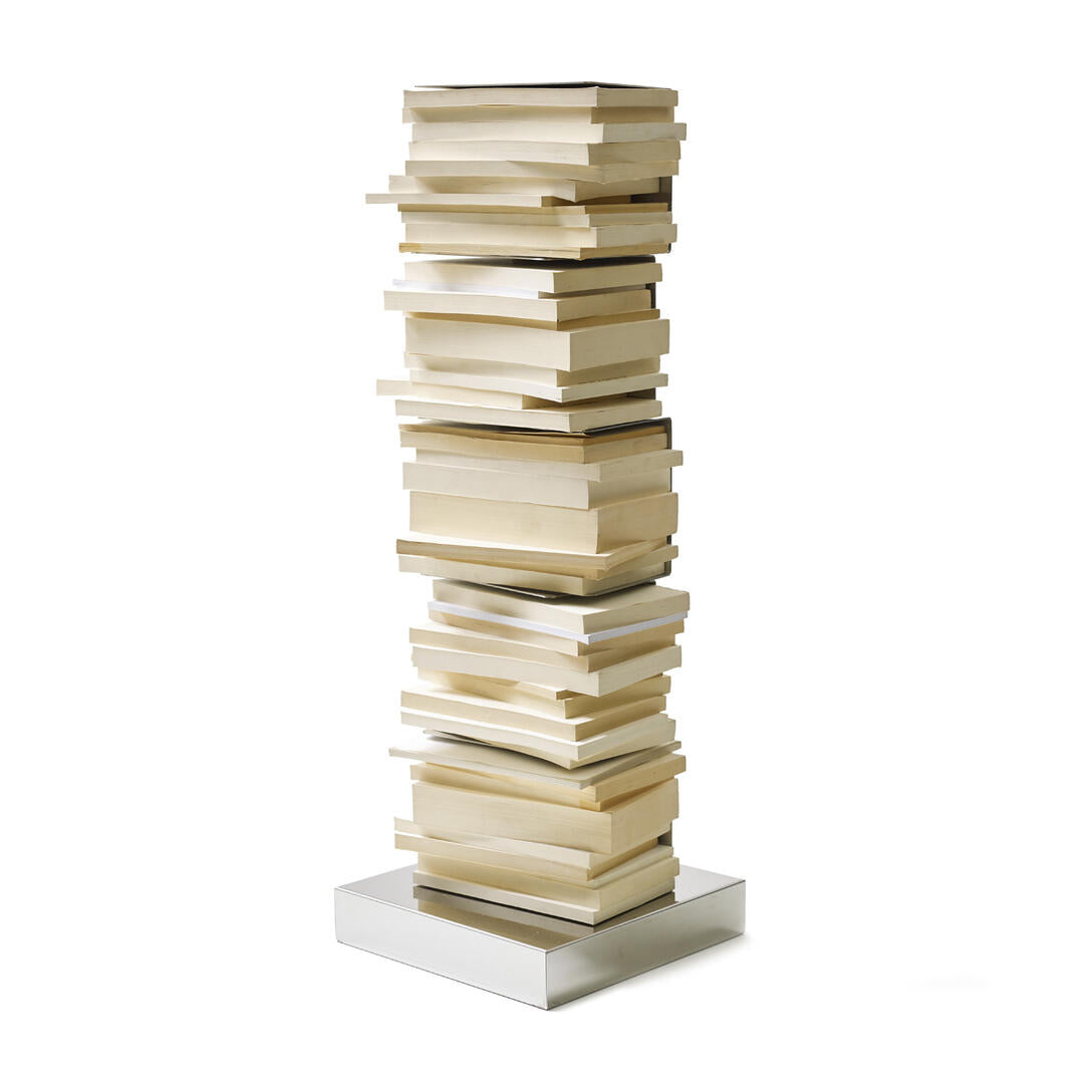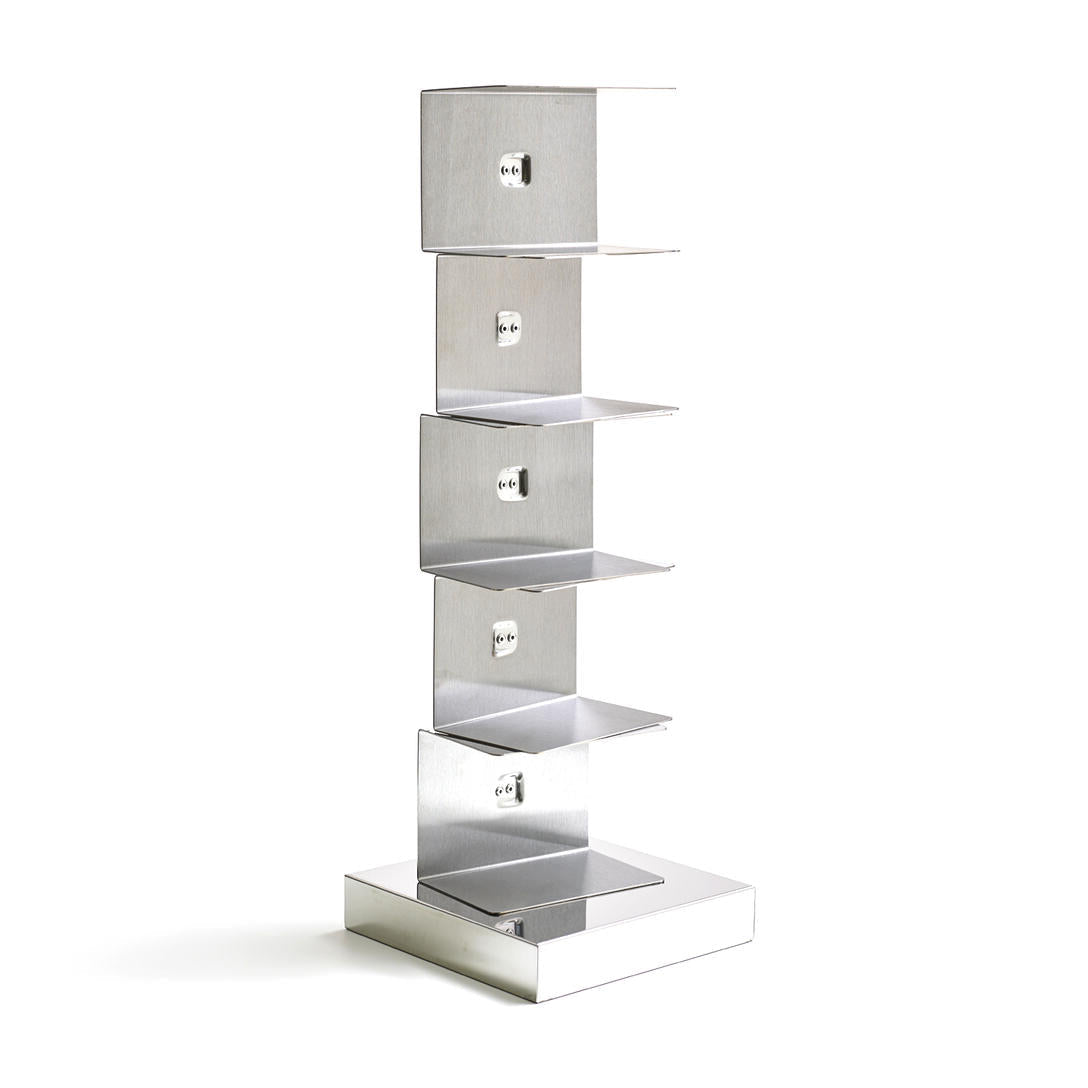 Regal Original Ptolomeo, entworfen von Bruno Rainaldi und ausgezeichnet mit dem prestigeträchtigen Compasso d’Oro im Jahr 2004, ist eine Ikone des modernen Designs, die die Art und Weise, wie Bücher aufbewahrt werden, revolutioniert. Dieses stehende, vertikale Regal ist auf den ersten Blick eine schlichte Stahl-Säule, an der dünne Regalböden befestigt sind. Gefüllt mit Büchern, verschwindet es aus dem Blickfeld und zeigt nur seinen Inhalt, was ihm einen einzigartigen Effekt verleiht – als ob die Bücher in der Luft schweben.