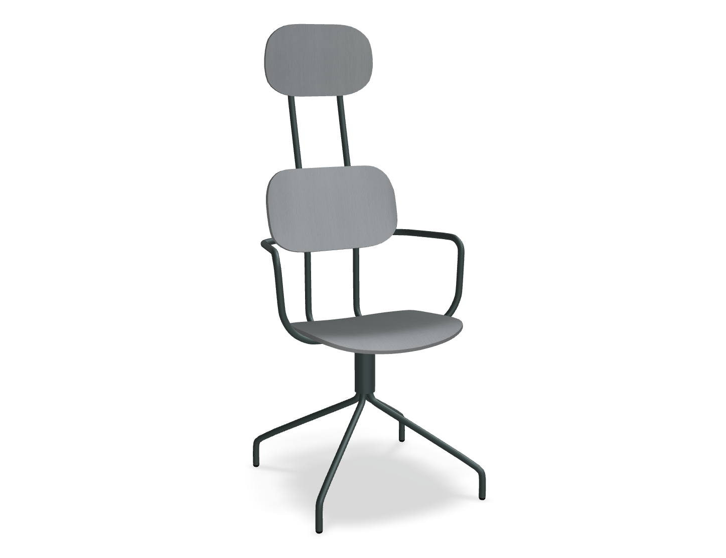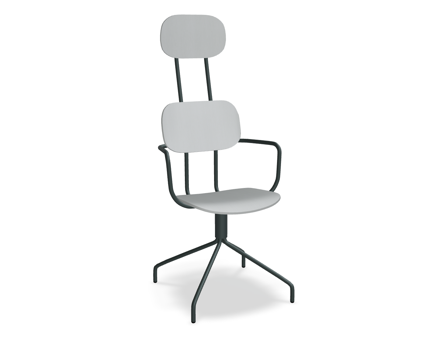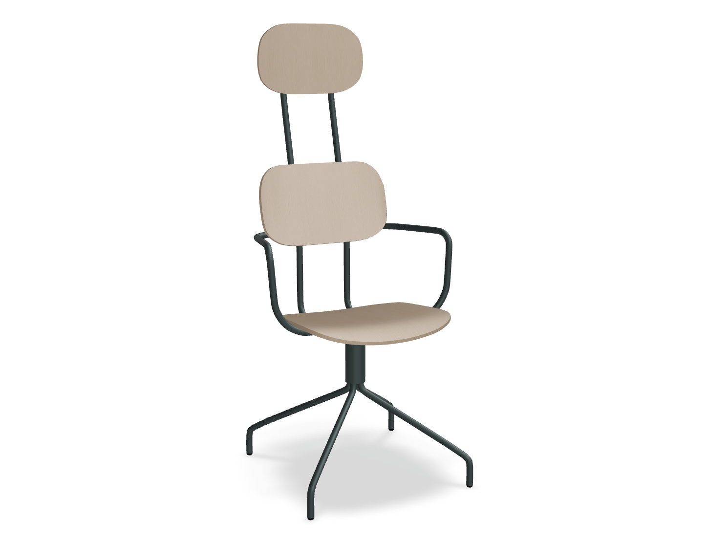 Drehstuhl Die neue Schule mit einer Kopfstütze, die von Studio mit Liebe entworfen wurde, zieht die Aufmerksamkeit mit einer modernen Form mit doppelter Unterstützung auf sich. Diese Rückenlehne betont nicht nur das moderne Design, sondern bietet auch eine hervorragende Unterstützung für den gesamten Rücken. Die rotierende Basis garantiert die Bewegungsfreiheit, und optionale Armlehnen erhöhen den Nutzungskomfort weiter. Die Sperrholzversion zeichnet sich durch Haltbarkeit und Leichtigkeit der Pflege aus, was sie zu einer idealen Wahl für den Raum viele Menschen macht.