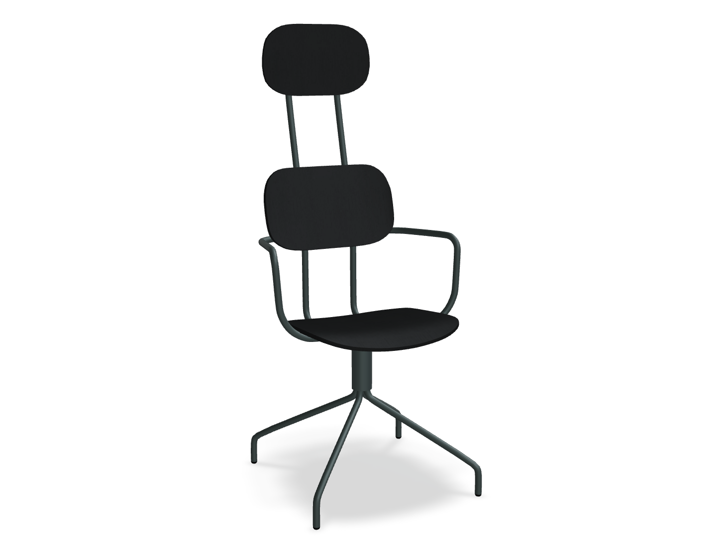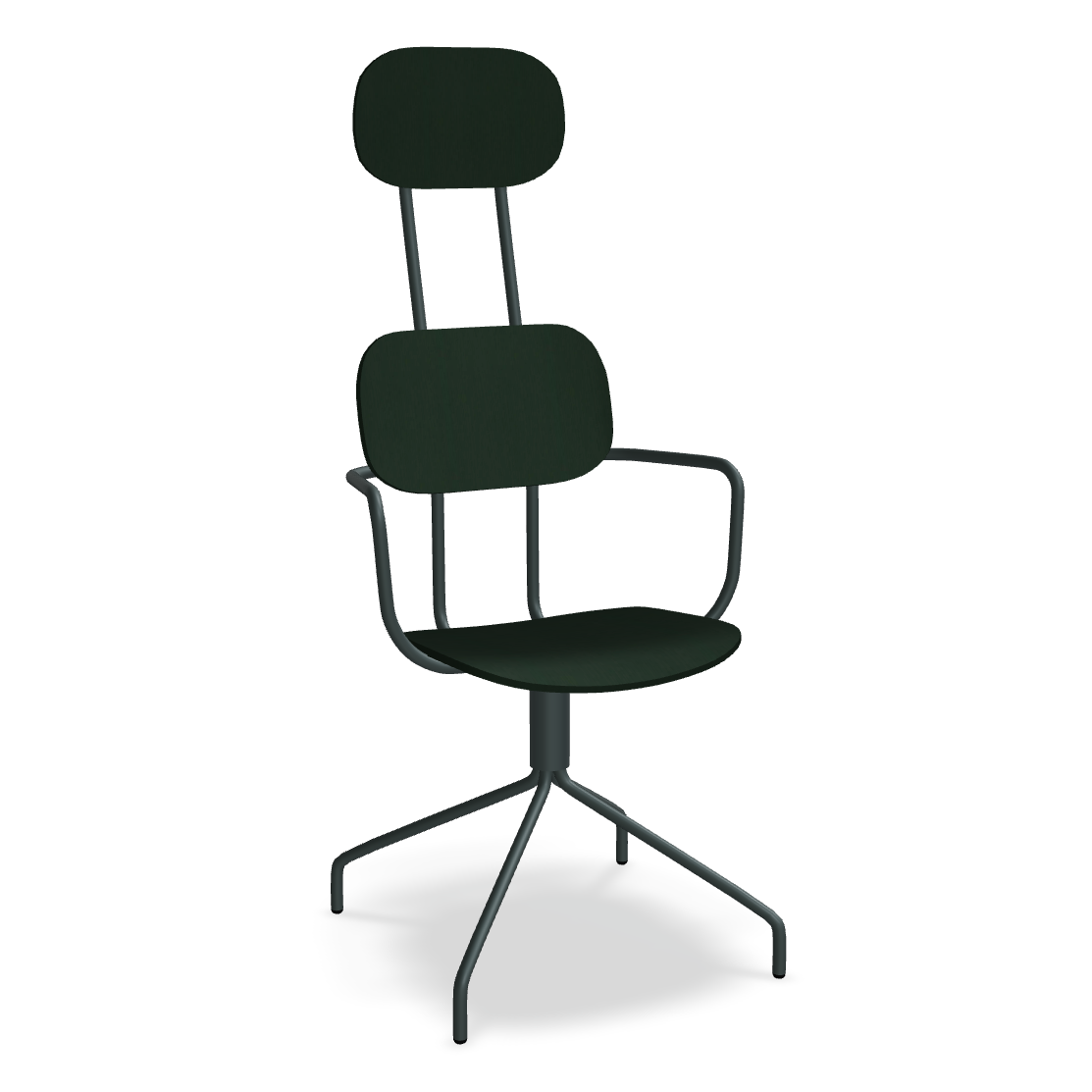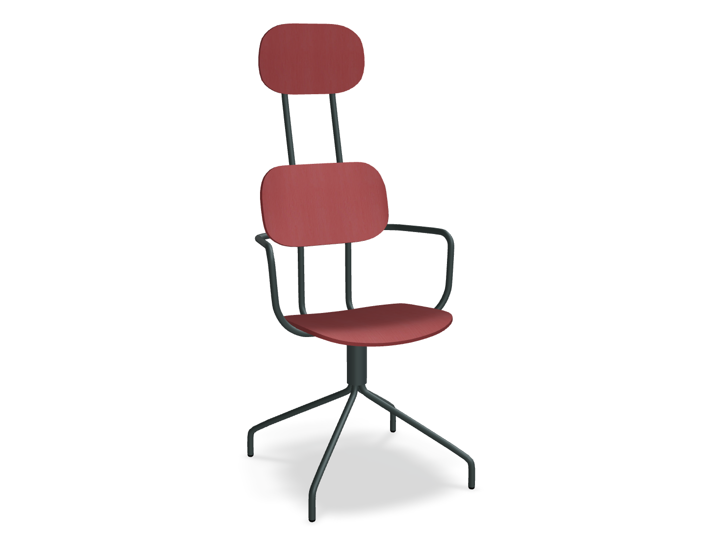 Drehstuhl Die neue Schule mit einer Kopfstütze, die von Studio mit Liebe entworfen wurde, zieht die Aufmerksamkeit mit einer modernen Form mit doppelter Unterstützung auf sich. Diese Rückenlehne betont nicht nur das moderne Design, sondern bietet auch eine hervorragende Unterstützung für den gesamten Rücken. Die rotierende Basis garantiert die Bewegungsfreiheit, und optionale Armlehnen erhöhen den Nutzungskomfort weiter. Die Sperrholzversion zeichnet sich durch Haltbarkeit und Leichtigkeit der Pflege aus, was sie zu einer idealen Wahl für den Raum viele Menschen macht.