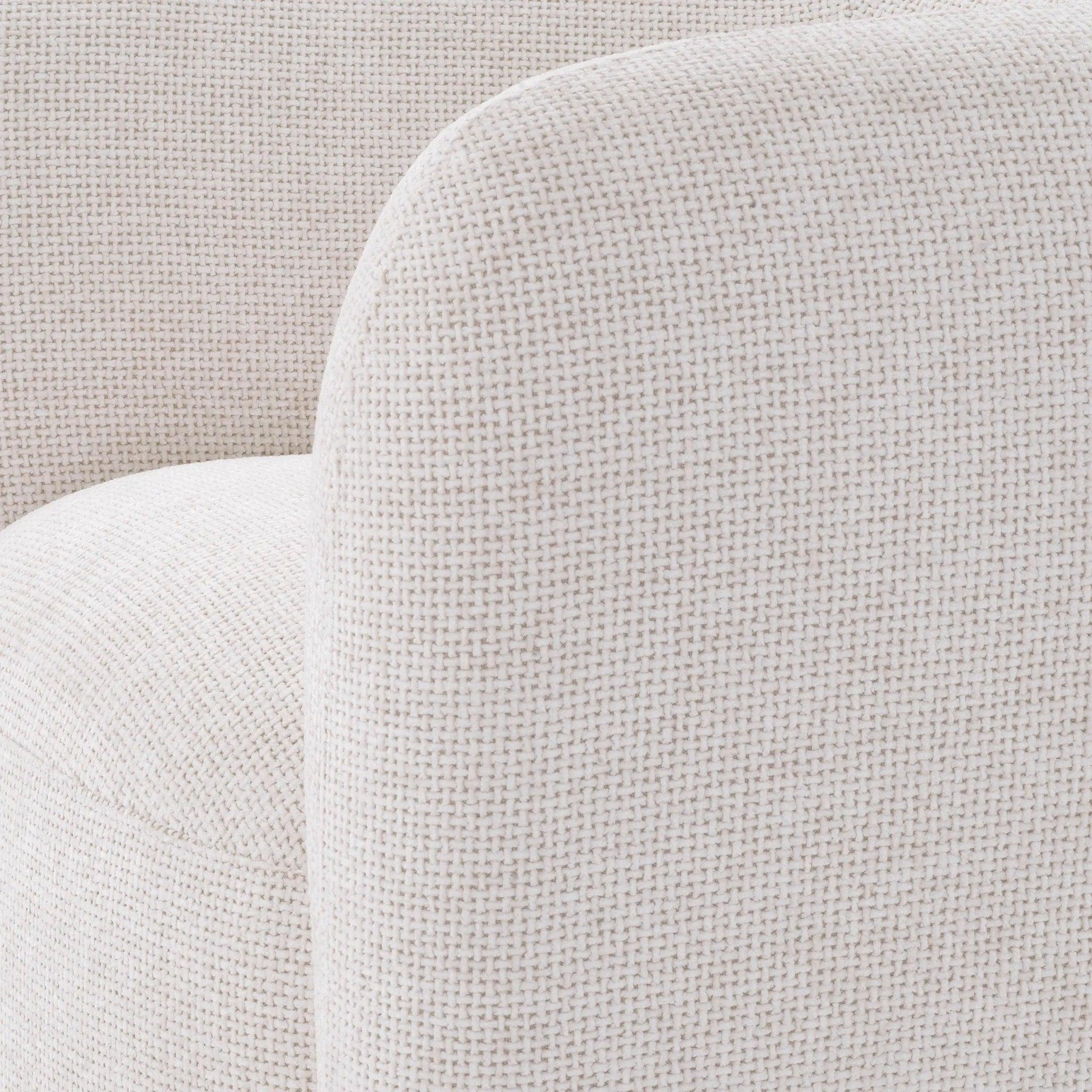 Der Roxy -Sessel besteht aus unserem zarten weißen Lyssa -Stoff, der Sie wie eine weiche Decke umhüllt. Dieses Gefühl ist so angenehm wie das Erscheinungsbild des Stuhls effektiv. Ein runder Sitz, der von einem Bogen umgeben ist, der nicht nur Eleganz verleiht, sondern Sie auch von Schulter zu Rücken schützt und fast einen Kokon Frieden entsteht. Die rotierende Basis aus gebürstetem Messing ist ein elegantes Detail, das dem Roxy -Stuhlcharakter verleiht. Es ist ein Möbelstück, das Aufmerksamkeit erregt und Ihrem Innenraum einen Charme verleiht.