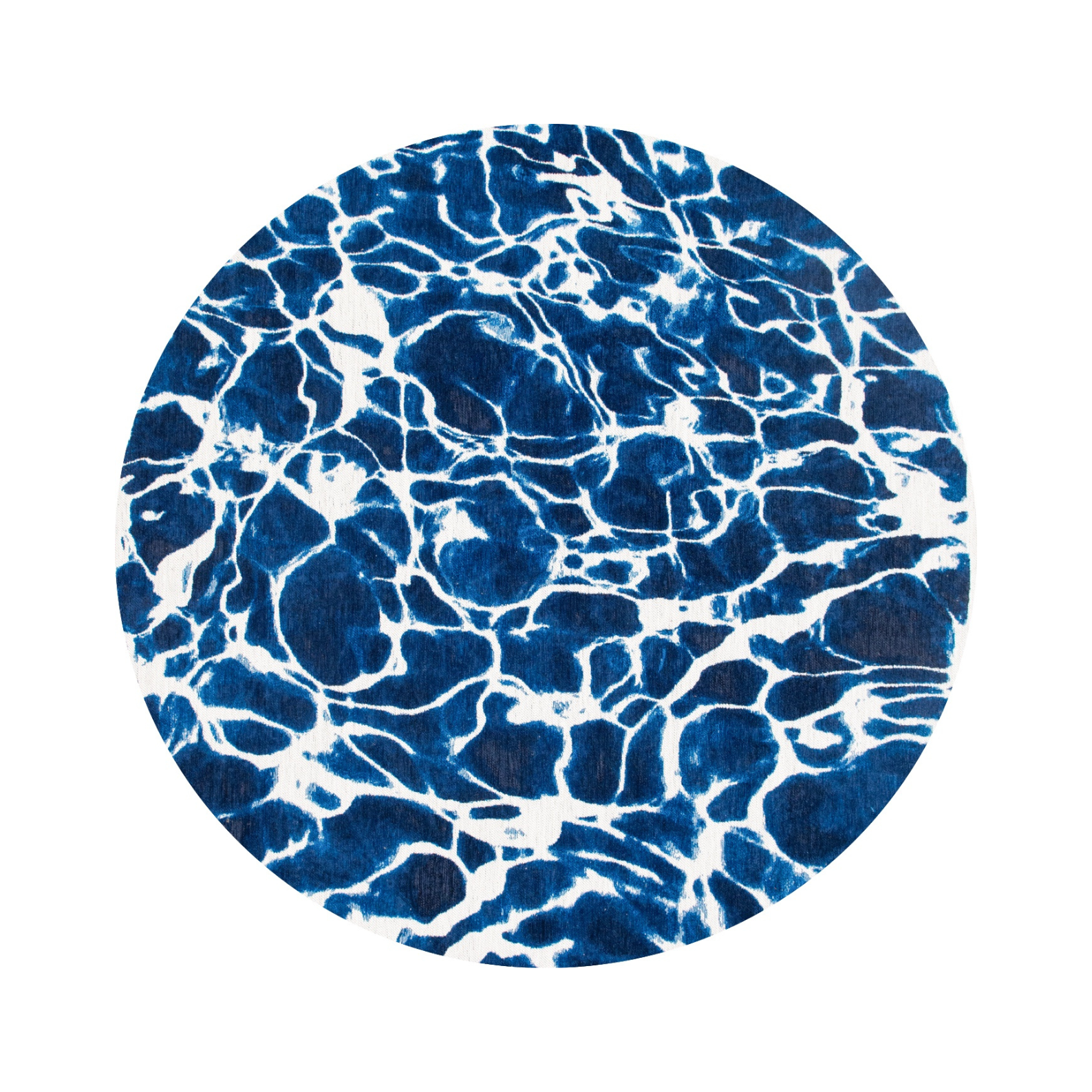 Runder abstrakter blauer Teppich Swim Surf Round wird Sie mit seinem einzigartigen Design, das sich auf Meer und Erde bezieht, auf jeden Fall erfreuen. Sein abstraktes Muster kombiniert auf harmonische Weise verschiedene Blautöne und erzeugen einen Effekt, der natürlichen Meereswellen und Naturstrukturen ähnelt. Die Farben gehen sanft ineinander ein, was dem Teppich ein spontanes und fesselndes Erscheinungsbild verleiht und eine Atmosphäre des Friedens und der Frische im Inneren einführt.