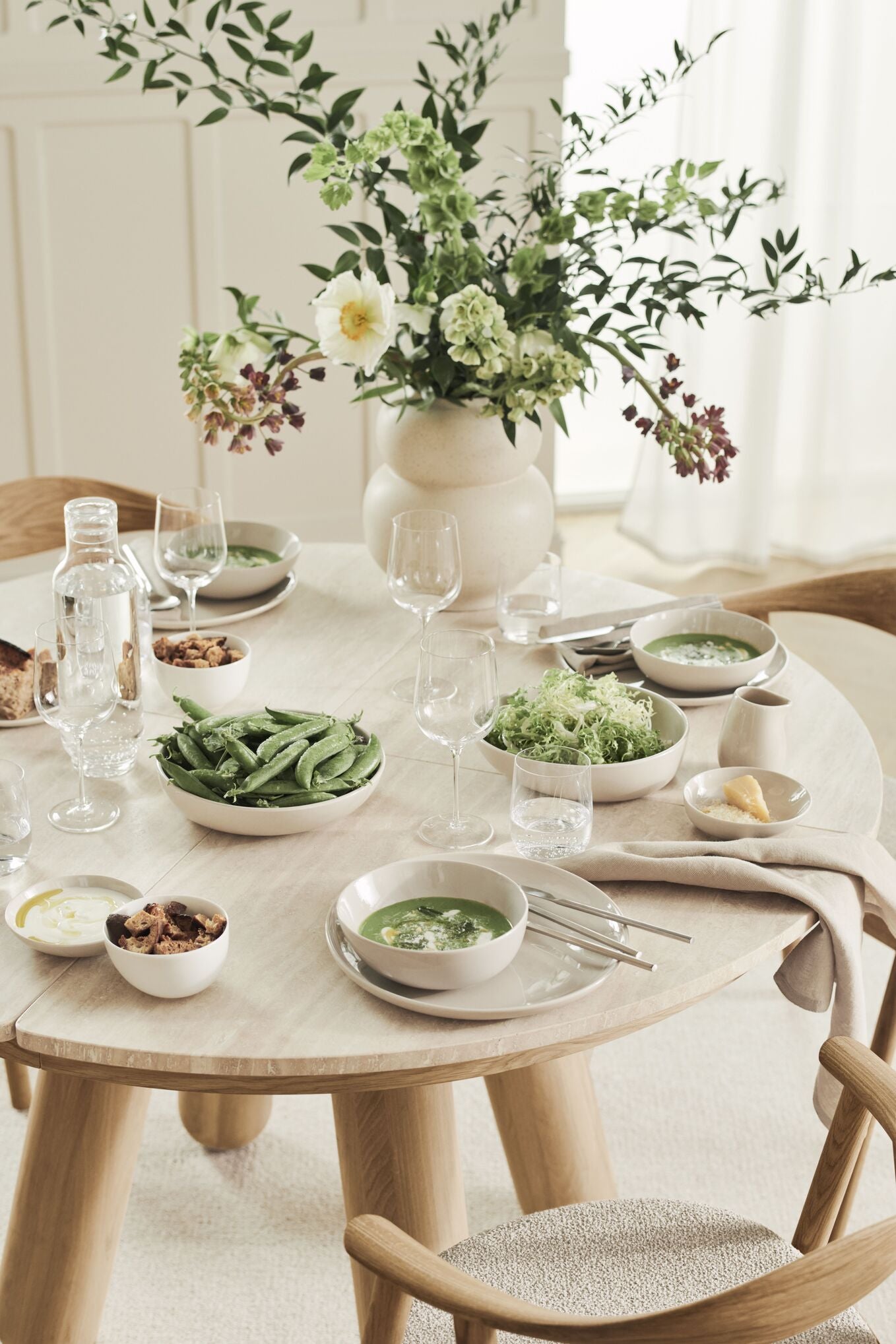 Tisch Balance ist ein einzigartiges Projekt des dänischen Designers Michael H. Nielsen, das ausdrucksstarke Linien mit eleganten und natürlichen Materialien kombiniert. Solide Beine aus FSC® -zertifiziertem Eichenholz sind eine stabile Basis für ein Luxussteinoberteil. Nach dem Entfalten erhält der Tisch zusätzliche Eichenverlängerungseinsätze, die fast ihre Länge verdoppeln, was sie zu einer idealen Lösung sowohl für tägliche Mahlzeiten als auch für größere Familien- oder soziale Meetings macht.
