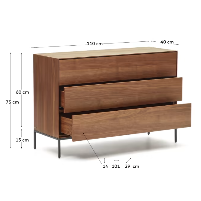 Kommode mit Schubladen Vedrana, entworfen von einem erfahrenen Designteam von La Forma, repräsentiert die perfekte Harmonie zwischen Nussbaumfurnier und Stahl und schafft eine außergewöhnliche Verbindung von Funktionalität und Ästhetik. Diese einzigartige Materialkombination macht Vedrana zu einer idealen Ergänzung für verschiedene Haustypen und Einrichtungsstile und betont deren Eleganz und Modernität.