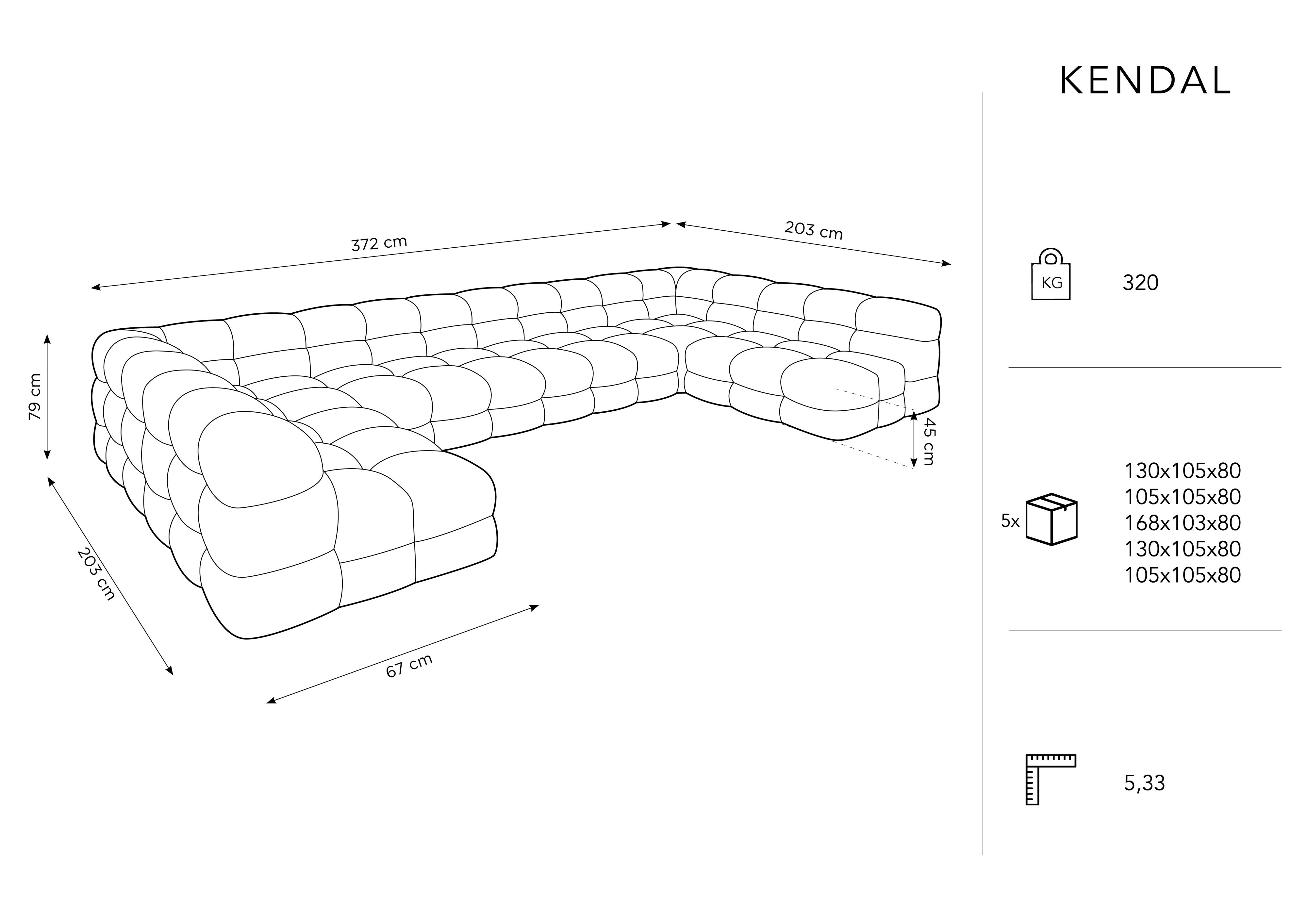 Der samtige U-förmige Ecksofa Kendal begeistert mit außergewöhnlichen Nähten und Steppungen, die dem Raum eine außergewöhnliche Eleganz im modernen klassischen Stil verleihen. Die blasenförmige Sitzfläche in Kombination mit der stilvollen Rückenlehne schafft einen komfortablen Ort zum Entspannen nach einem langen Tag.Kendal überrascht mit einer etwas avantgardistischen Form und zieht die Aufmerksamkeit auf sich, egal von welcher Seite wir es betrachten.