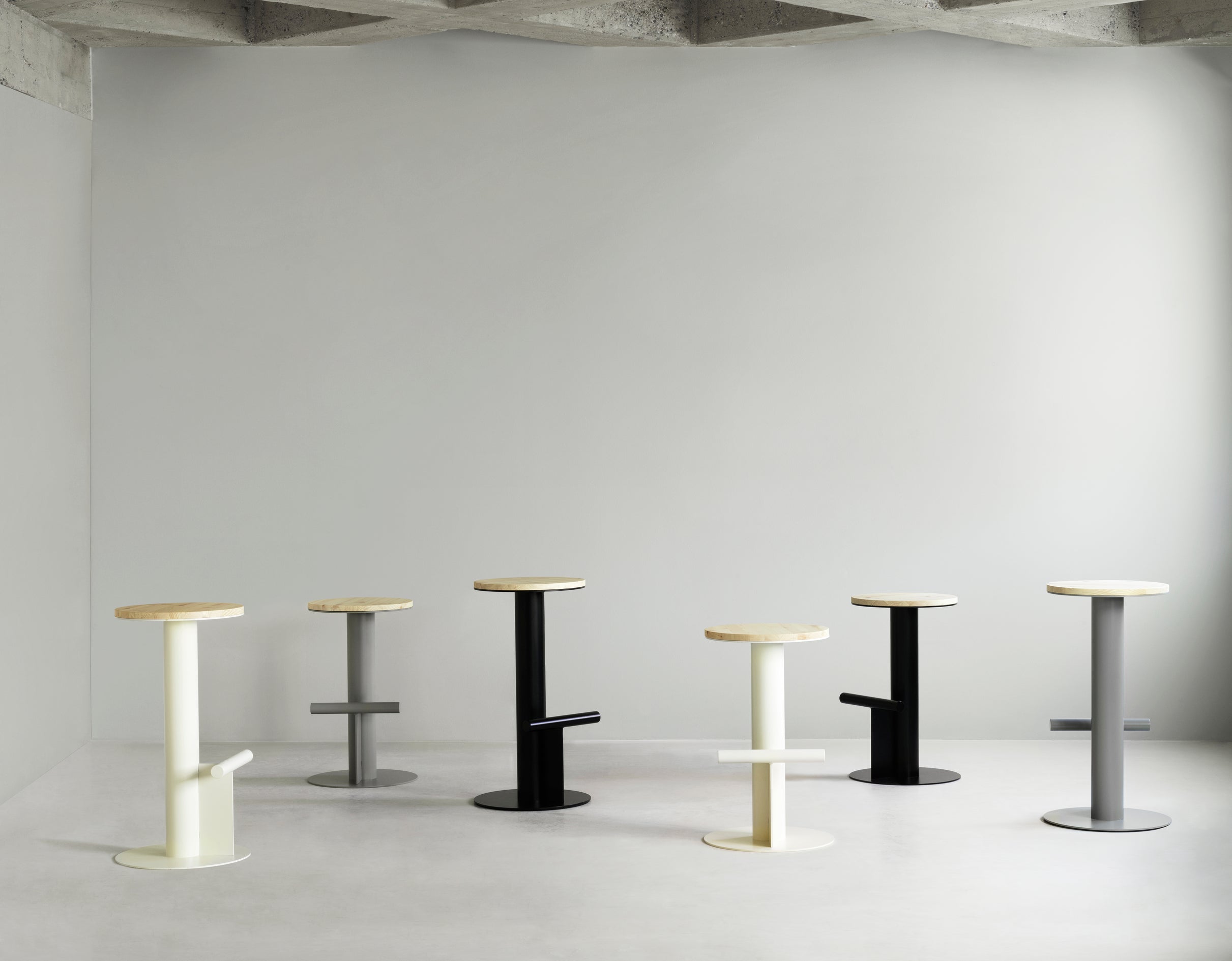 Hoker Das Feld ist ein ausgeprägtes Design ohne unnötige Details, in dem der Schwerpunkt auf hoher Qualität, langlebigen Materialien und sauberem, elegantem Design des Designs gelegt wurde. Trotz seiner Einfachheit sticht das Feld von den klassischen Barhockern ab. Ein runder, fester Kiefernsitz ruht auf einer ungewöhnlichen Basis aus pulvergesteuerter Stahlrohr. Ein horizontal platzierter, kleinerer Stahlstab fungiert als Fußstütze und ist ein dekoratives Element.
