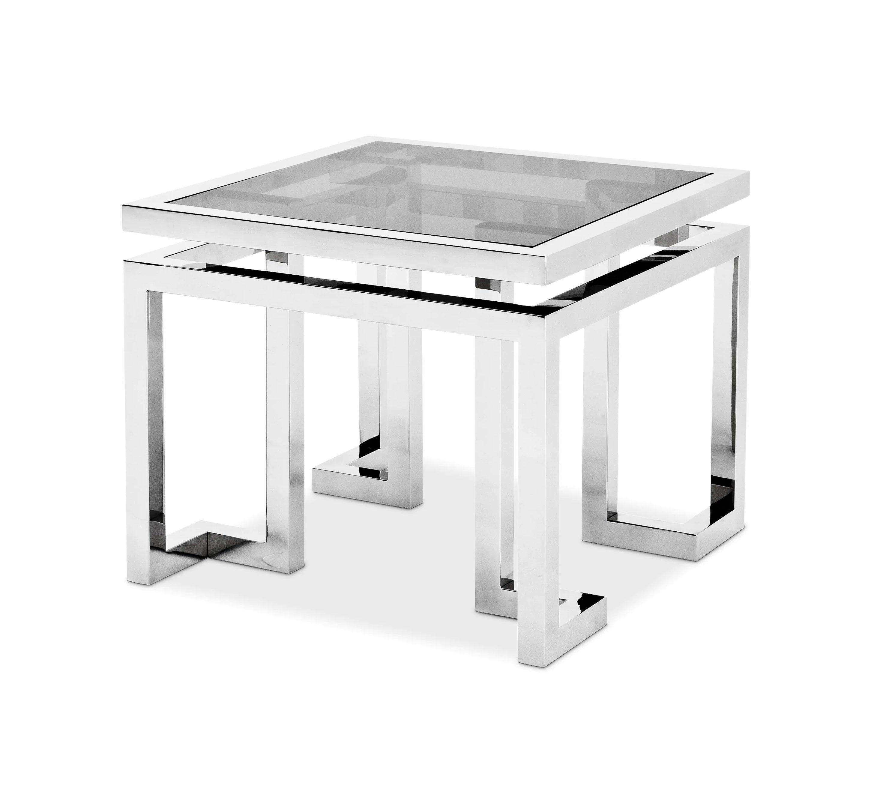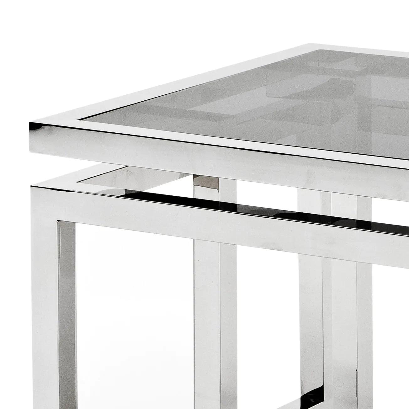 Jeder Winkel, jede Linie dieser Tabelle ist durchdacht und mit Präzision hergestellt, die an Handwerker aus dem letzten Jahrhundert erinnert. Das Leuchten des goldenen Finishs des Edelstahlrahmens steht im Gegensatz zu einem tiefen Schatten aus geräuchertem Glas und erzeugt einen so klassischen Effekt wie zeitgemäß. Das Tisch, was nicht nur funktional ist, sondern auch ins Auge fällt und in jedem Raum zu einem Mittelpunkt der Aufmerksamkeit wird.