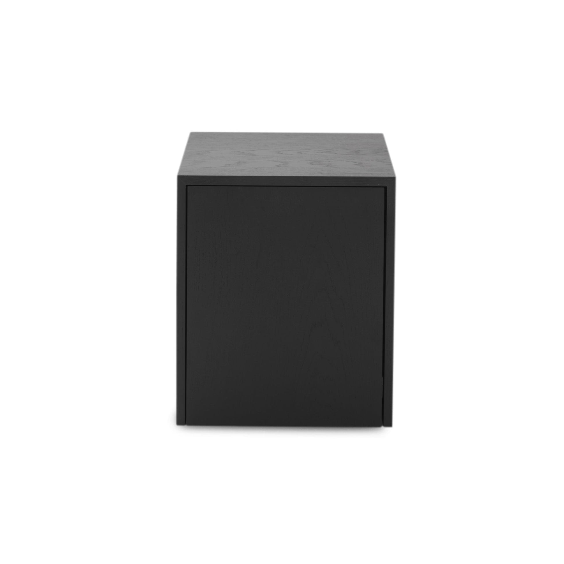 Seitentisch Masse mit einer Schublade ist eine Kombination aus moderner Eleganz und Funktionalität. Aus Eichenfurnier in einem schwarzen Finish wird durch minimalistische Ästhetik ausgezeichnet, wobei der zeitlose Charakter betont wird. Die geometrische Form und das sorgfältige Finish machen es perfekt in modernen, industriellen und klassischen Innenarchitekten.
