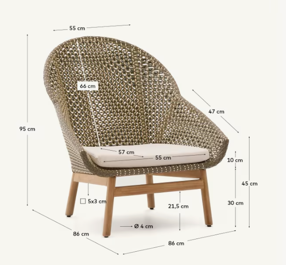 Für maximalen Komfort ist der Sessel mit abnehmbaren Kissen ausgestattet, die pflegeleicht sind. Das wasserfeste Schaumstoffmaterial macht ihn ideal für überdachte Außenbereiche. Mit seinem eleganten Design und langlebigen Materialien ist Olbia die perfekte Ergänzung für Ihre Terrasse, Ihren Garten oder Ihre Veranda und vereint Komfort, natürliche Optik und Strapazierfähigkeit, die jahrelang hält.