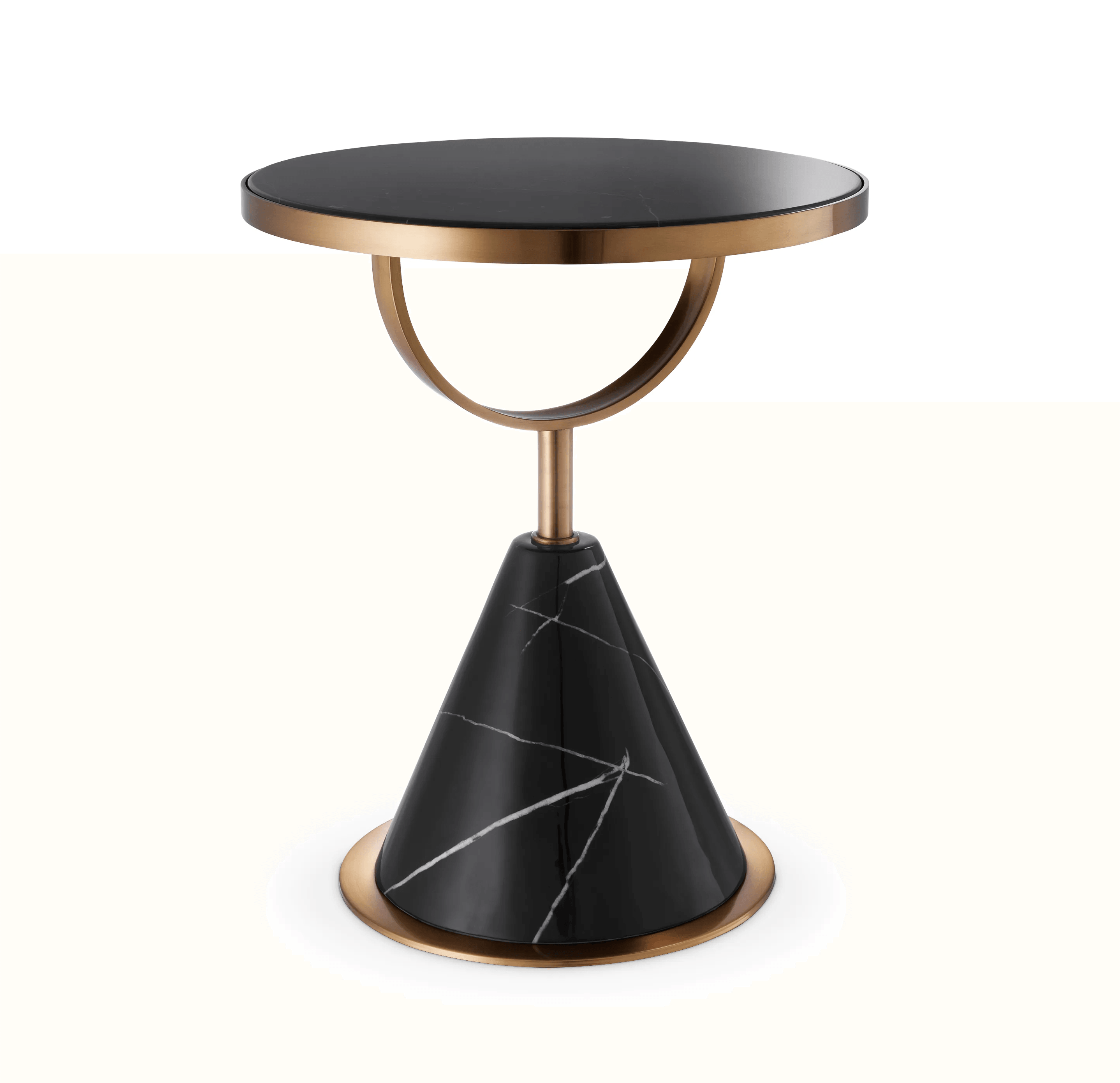 Das Top, das bei der Nachahmung des schwarzen Marmors hergestellt wurde, macht die Oberfläche nicht nur glatt und glänzend, sondern fügt dem Tisch auch eine tiefe Marmorästhetik hinzu, die seit Jahrhunderten gleichbedeutend mit Luxus ist. Seine konische Basis bedeutet, dass das Design die moderne Leichtigkeit annimmt, ohne die Stabilität zu verlieren. Darüber hinaus verleiht das schwarze Finish den gesamten Möbeln einen warmen, metallischen Glanz, der Notizen über Adel und Raffinesse verleiht. Es harmoniert perfekt mit dunklem Marmor und schafft eine harmonische und ausgewogene Komposition.